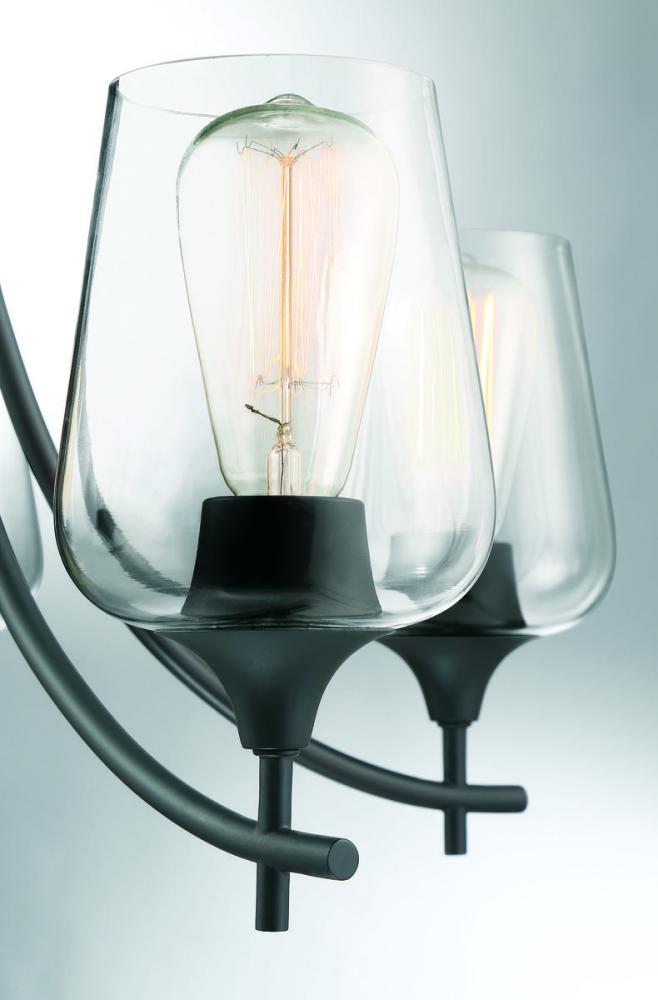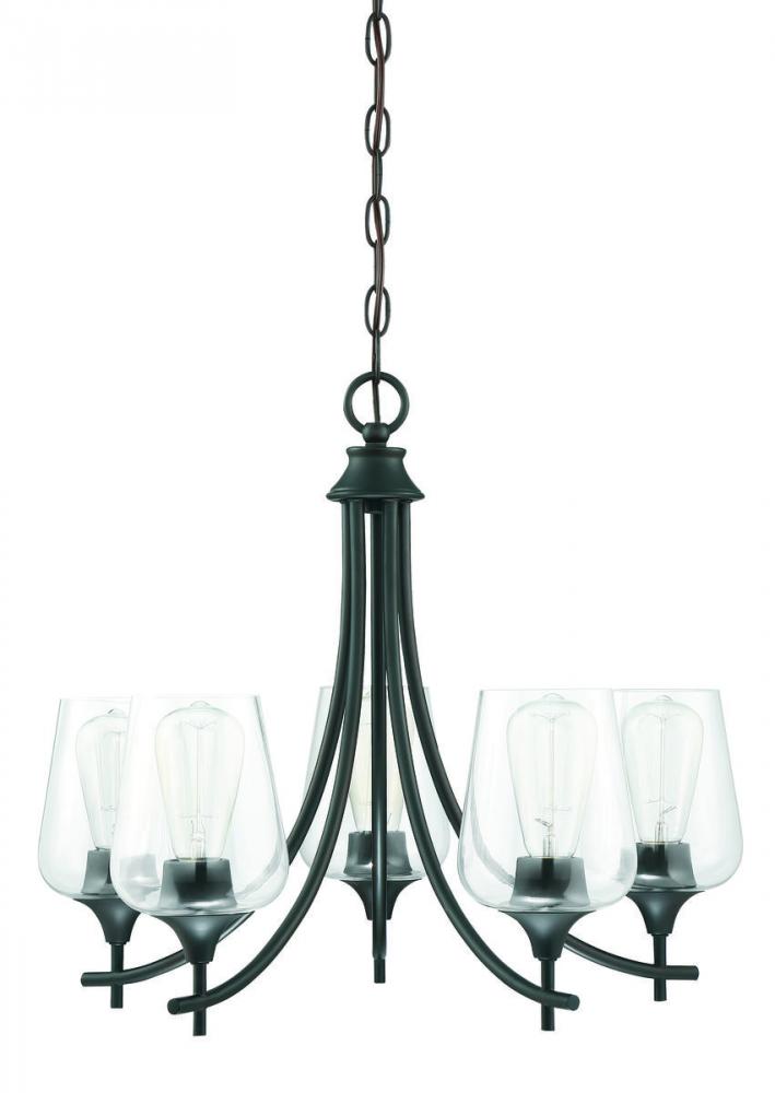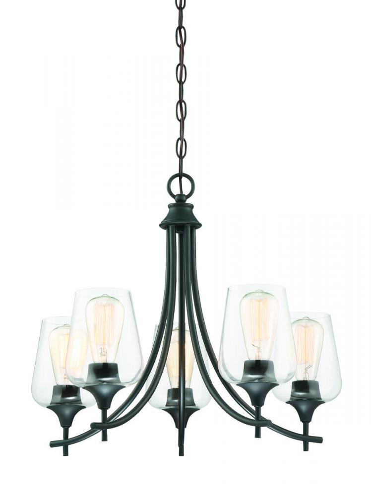 This 5-light chandelier from the Savoy House Octave collection has understated elegance. It features large curved shades of clear glass, minimal detailing and a bold English bronze finish. Chandeliers can be used in a wide variety of spaces, including but certainly not limited to dining rooms, living rooms, great rooms, bedrooms, kitchens, foyers, offices, closets and even bathrooms! Because this chandelier is chain-hung, you can use as much or as little chain as you need to fit your specific hanging height needs, and it can be used on a sloped ceiling. Since the bulbs are exposed, try using stylized bulbs (not included) like Edison style for a different twist! The English bronze finish can be paired with bronze hardware or mixed with hardware in other finishes. Try the Octave with glam, transitional or contemporary style rooms for a chic look. When you choose a Savoy House lighting fixture, you can be certain you've selected a piece that will withstand the test of time.