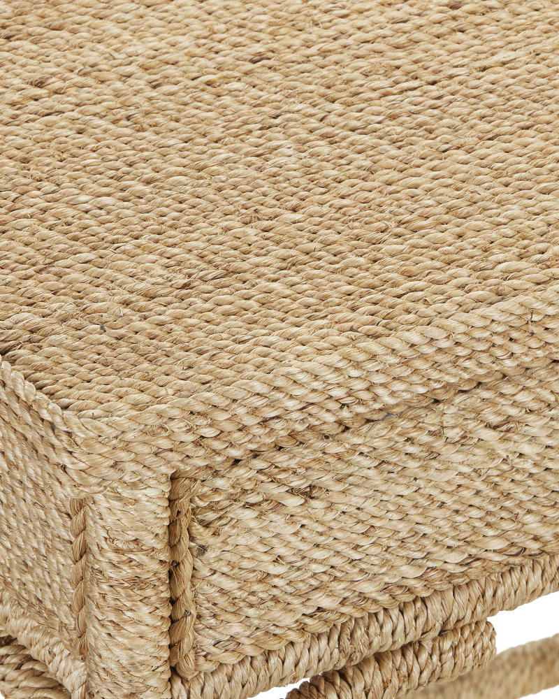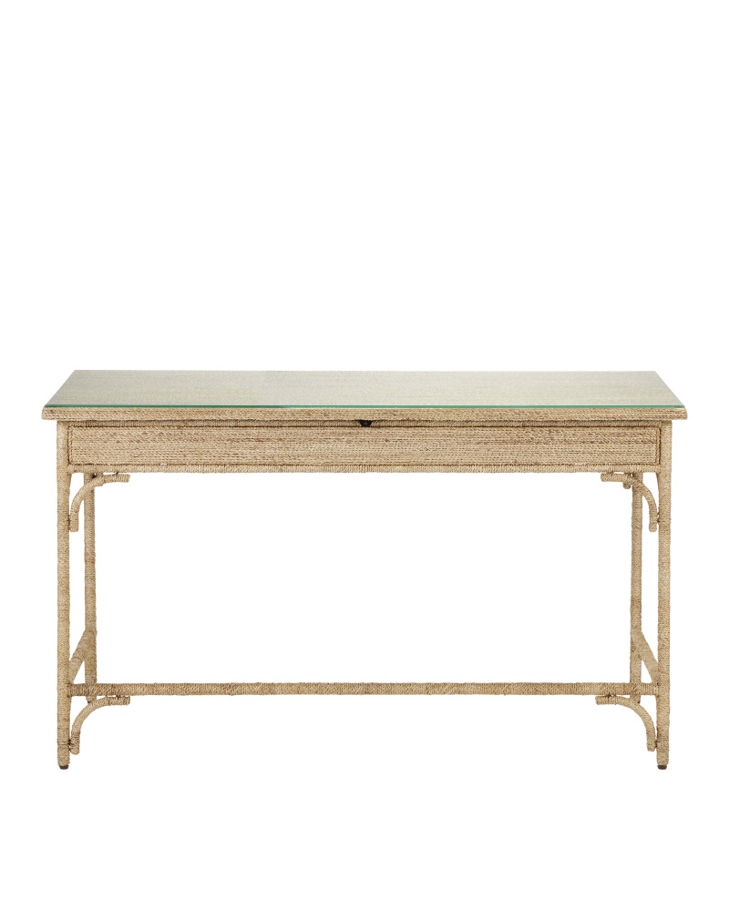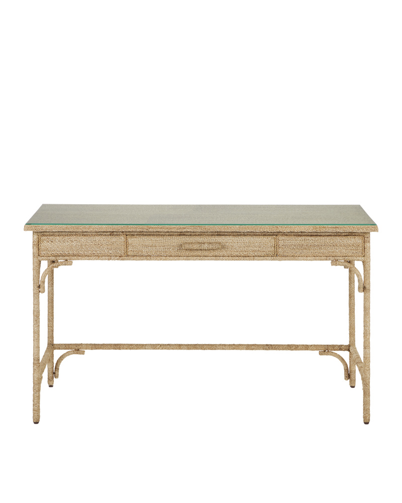 An earthy alternative to rattan and wicker, the Olisa Rope Desk is covered in braided abaca rope to bring a natural elegance to a room. The dexterity required to wrap a piece of furniture so skillfully makes this tan desk special. The artistic quality of this rope-wrapped desk makes it a stunning choice for a home office or a business-formal office in which style matters. This desk comes with a glass top that fits into the outer rim of the top, and there is a beige finish inside its drawer.