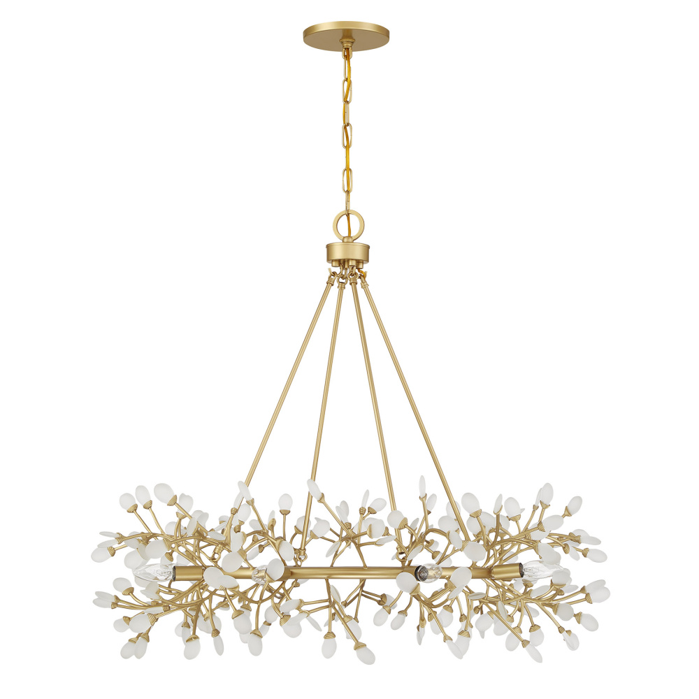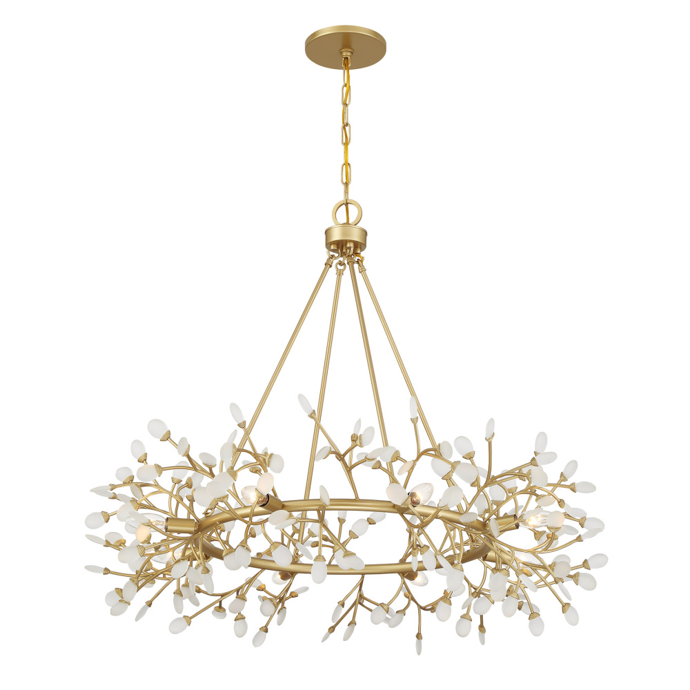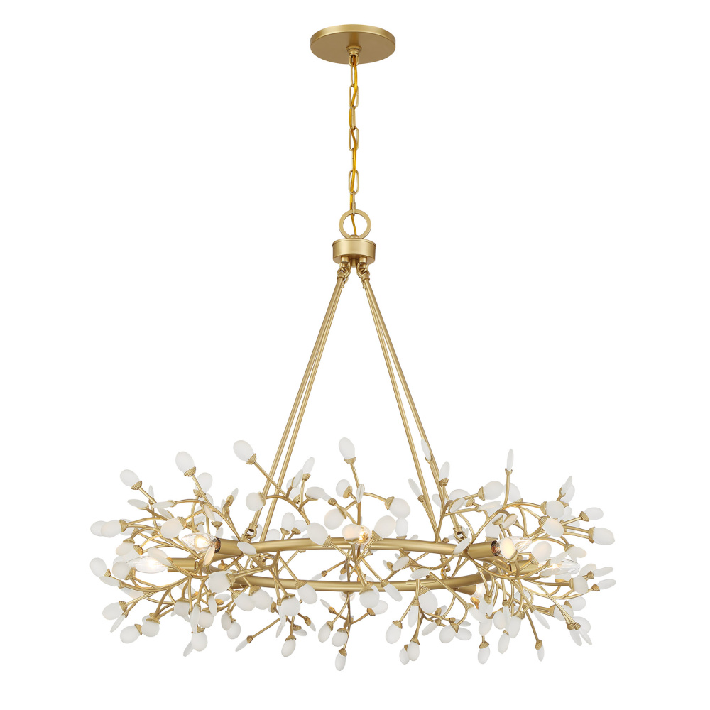 Illuminate any space in style with the stunning Savoy House Once 8-light chandelier. Designed by award-winning interior designer and TV host Breegan Jane, this jewelry-like look is inspired by the first-ever custom piece she created at age 11. Once means eleven in Spanish! The whimsical design embodies the playful and audacious spirit Breegan has been putting into her designs since she was just a child. Delicate buds of soft white frosted sea glass are lovingly affixed to branches finished in Spun Gold that blossom from the circular frame. Once is 32" in height and 36" in width. Uses eight candelabra size bulbs of up to 60 watts per bulb. Bulbs not included. Comes with 120" of chain.
