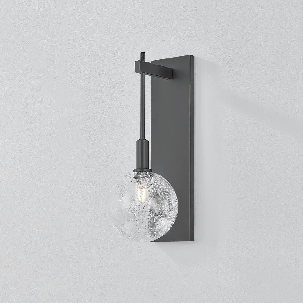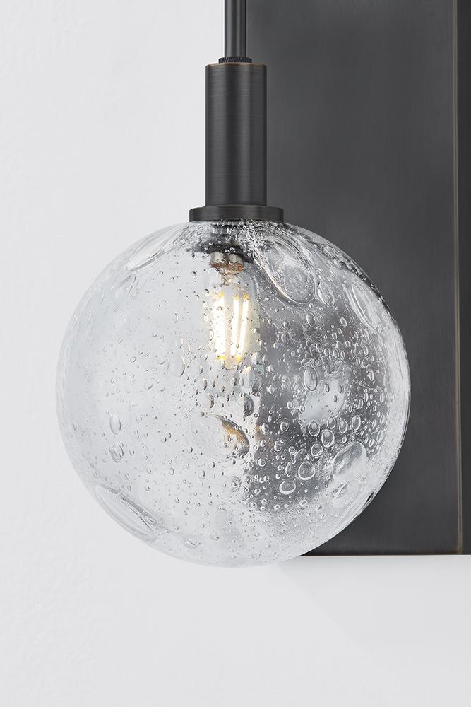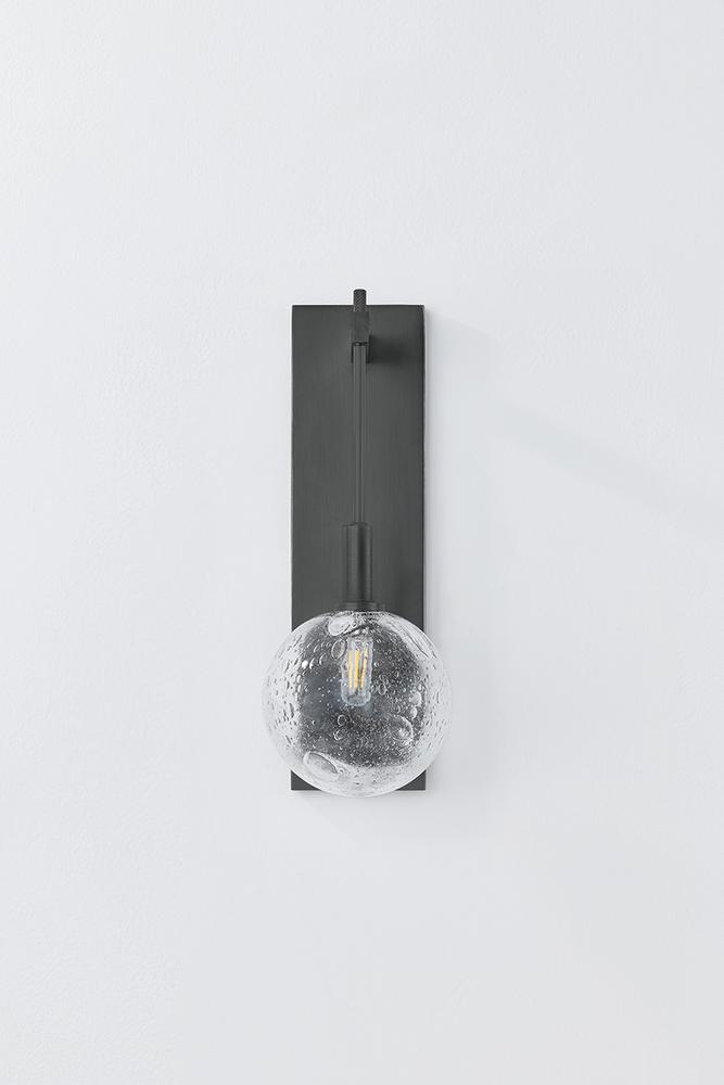 Drawing inspiration from a clock pendulum, the artful silhouette of Onteora makes a striking statement on the wall. The verticality and sleek forms call attention to the finer details, from the ornate seedy glass to the extended stem. This one-light sconce is available in a luxe Aged Brass finish or an industrial Distressed Bronze finish.