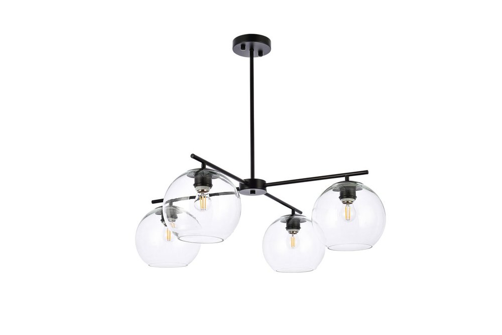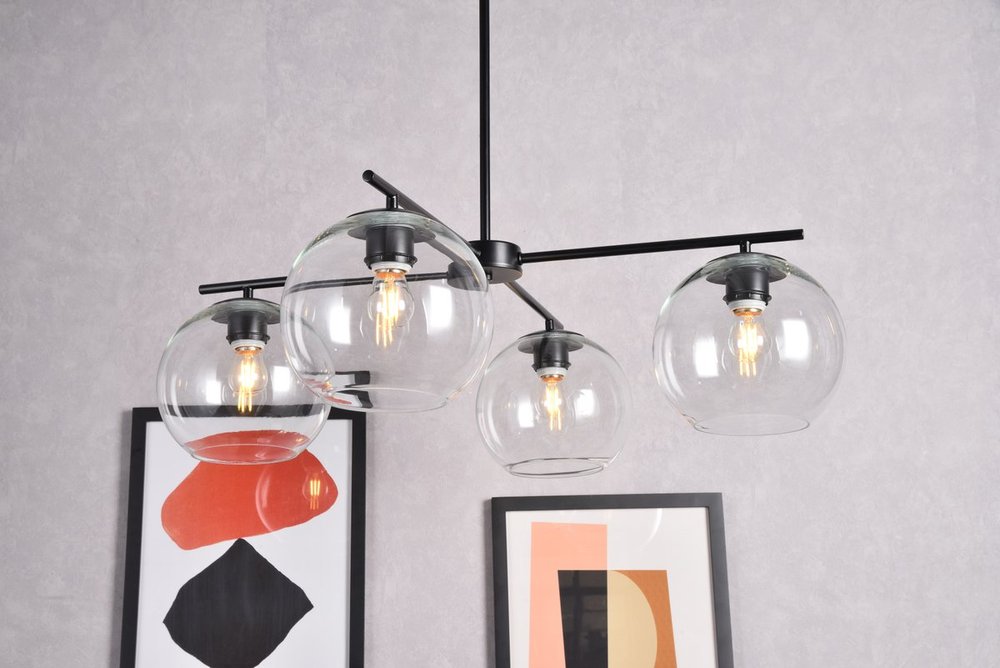 The Opus Collection includes a pendant lamp that gives a bubble effect. With its rounded glass, the ball protects the bulb which lights up and shines through. Place this in anywhere and the fixture will speak for itself. This fixture is dimmable, requires four E26 lamps, and comes in three different finishes--- black, brass, and chrome. Light bulbs not included.