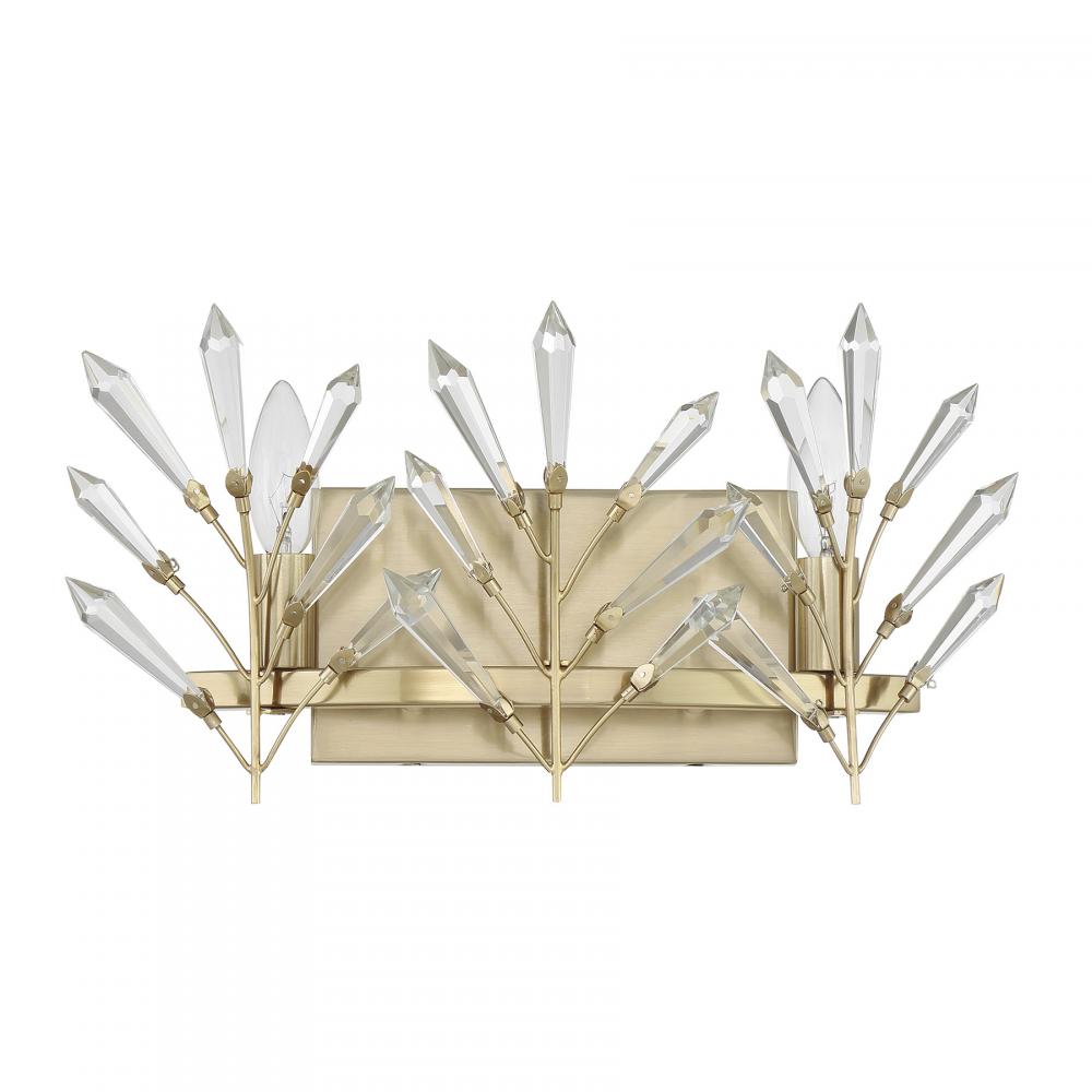 Decorate your home with the beautiful, nature-inspired Savoy House Orianna 2-light bath light. Its frame holds slim branches that are adorned with icicle-cut clear crystal accents. They glint and glimmer when illuminated and make a perfect match with the Noble Brass finish. Orianna is 8" in height, 14.5" in width and extends 5.5" from the wall. Uses two candelabra size bulbs of up to 60 watts per bulb. Bulbs not included. Mount as pictured. This bath bar is damp area rated.