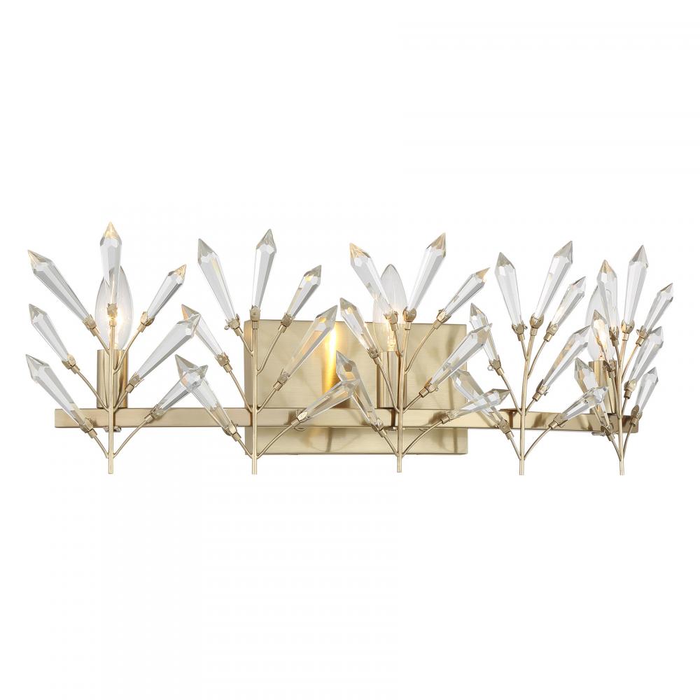 Decorate your home with the beautiful, nature-inspired Savoy House Orianna 3-light bath light. Its frame holds slim branches that are adorned with icicle-cut clear crystal accents. They glint and glimmer when illuminated and make a perfect match with the Noble Brass finish. Orianna is 8" in height, 24" in width and extends 6" from the wall. Uses three candelabra size bulbs of up to 60 watts per bulb. Bulbs not included. Mount as pictured. This bath bar is damp area rated.