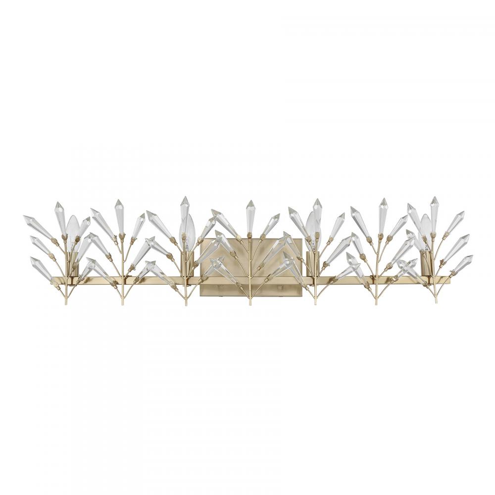 Decorate your home with the beautiful, nature-inspired Savoy House Orianna 4-light bath light. Its frame holds slim branches that are adorned with icicle-cut clear crystal accents. They glint and glimmer when illuminated and make a perfect match with the Noble Brass finish. Orianna is 8" in height, 33" in width and extends 7.5" from the wall. Uses four candelabra size bulbs of up to 60 watts per bulb. Bulbs not included. Mount as pictured. This bath bar is damp area rated.