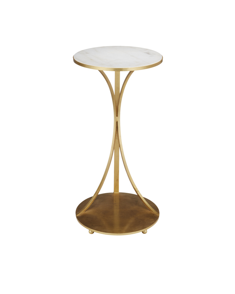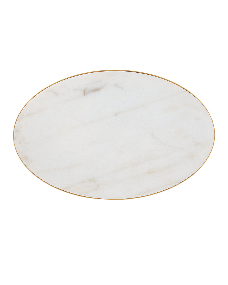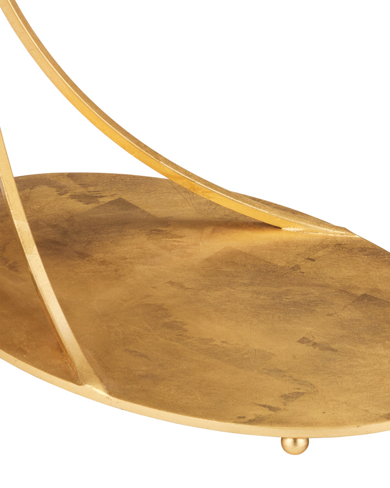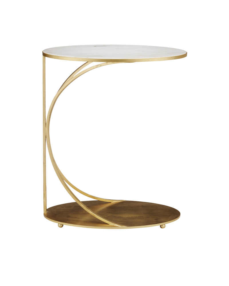 The Orla C Table is a gold cantilever table with delicate lines. Thin ribs of metal rise up from the oval base to support the oval top. The luminous gold leaf finish on the metal contrasts the crisp inset white marble top. The base has tiny ball feel that lift it slightly off the floor.