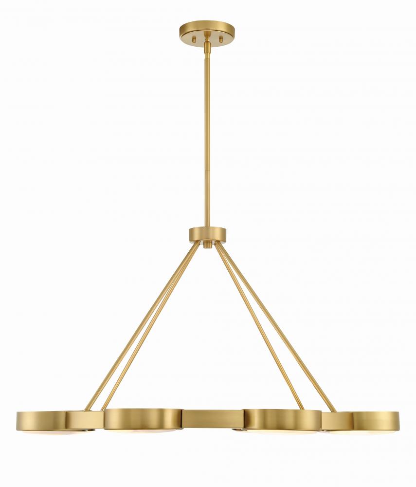 The Orson Collection is now available with exquisite alabaster stone detail. Crafted from natural stone with distinctive veining patterns, these oversized discs emit a soft, downward light that bathes your surroundings in an organic, tranquil ambiance. At the same time, the open-top design allows for an elegant upward light flow. The eye-catching thick banded metal frame elegantly wraps around the alabaster stone, ensuring a unique and captivating look. The Orson linear chandelier offers adjustable arms, allowing you to tailor the fixture to your desired profile for any space, emphasizing the alabaster's organic beauty and translucent quality.