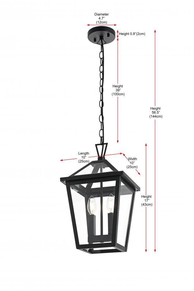 Introduce a classic and timeless glow to your outdoor space with this stunning lantern-style pendant light. Featuring a classic tapered frame and sophisticated matte black finish, this pendant light brings a refined, versatile aesthetic that enhances any home exterior, whether traditional or contemporary. with dual candelabra bulb holders, this pendant adds a vintage touch while ensuring bright, effective illumination. The tapered glass panels allow for maximum light output, creating a warm and inviting ambiance. Built from weather-resistant metal and ETL certified for wet locations, this pendant is crafted to withstand the elements while maintaining its beauty. Its adjustable chain allows for easy height customization, making it suitable for porches, patios, or entryways. Illuminate your home in style with this beautifully crafted outdoor pendant light.