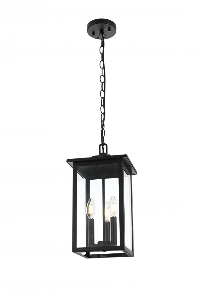 Add a touch of timeless charm to your outdoor living spaces with this elegant outdoor pendant light. Featuring a classic lantern silhouette with four clear glass panels, this pendant creates a bright, inviting glow that is perfect for patios, porches, or entryways. The three candelabra-style bulb holders offer a traditional touch, evoking the look of vintage lanterns while still fitting seamlessly into modern settings. Finished in matte black, this pendant light provides a versatile aesthetic that complements a variety of decor styles. Constructed with durable metal and ETL rated for wet locations, this light is built to withstand outdoor conditions, ensuring long-lasting performance. The adjustable hanging chain makes it easy to tailor the height for a perfect fit, enhancing both the beauty and functionality of your outdoor space.