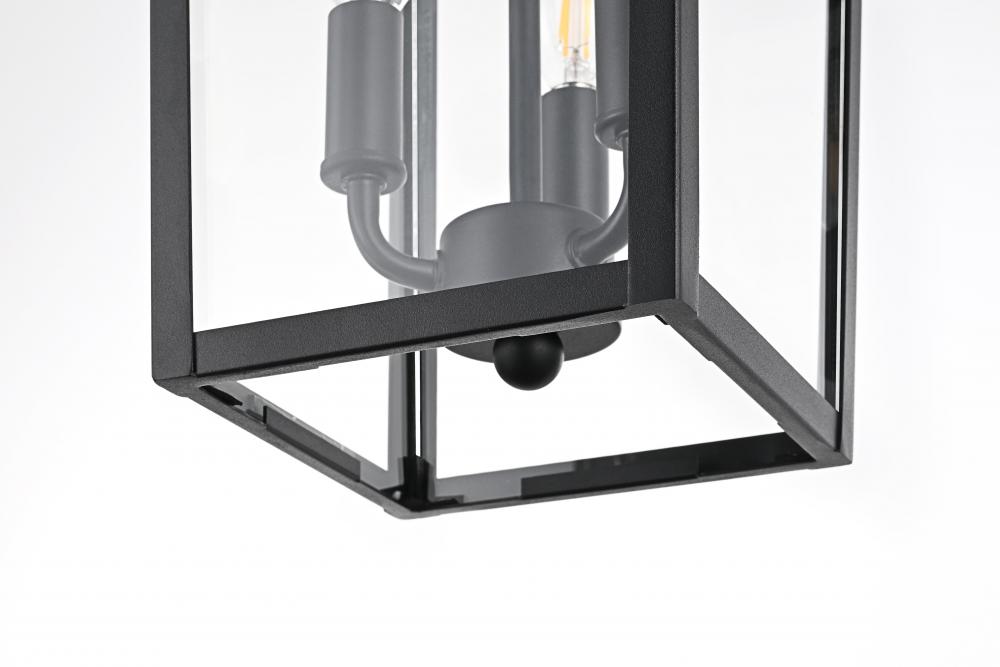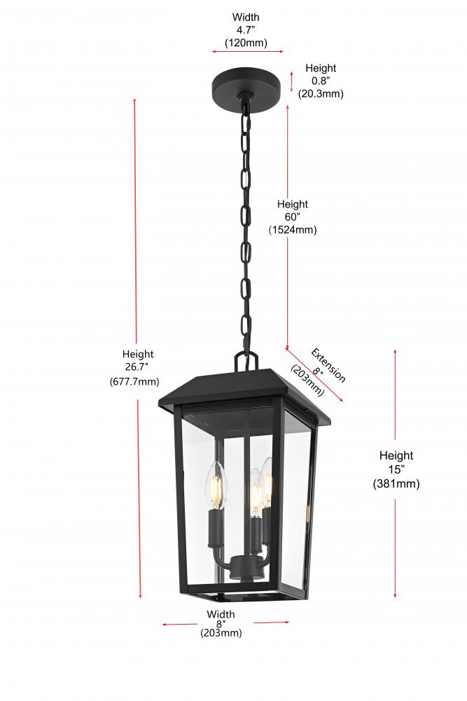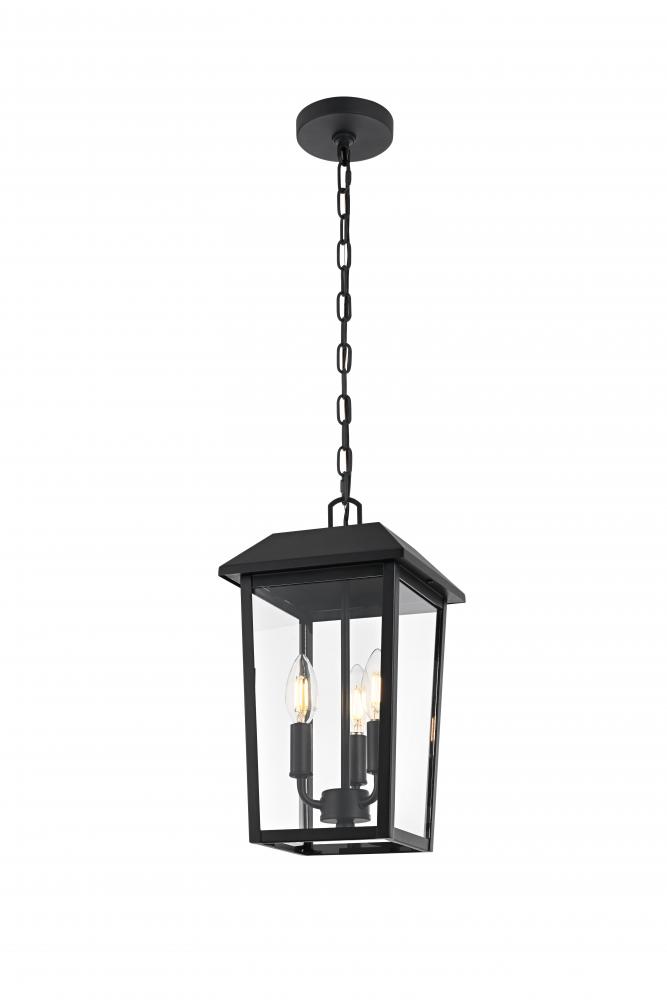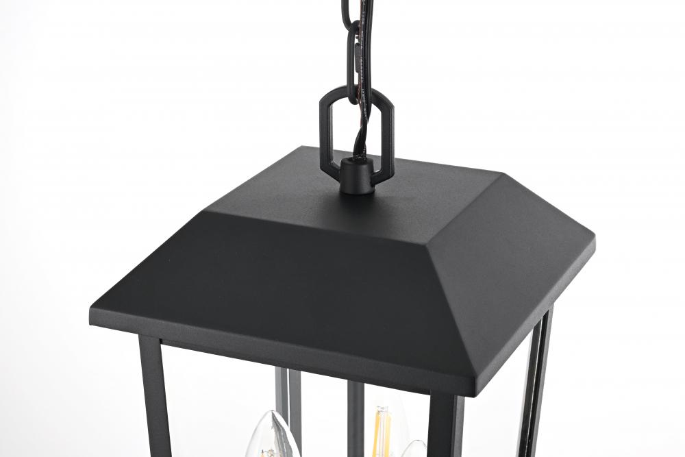 Create a warm, inviting glow in your outdoor spaces with this stylish pendant light. Featuring a classic lantern-style frame made from durable iron, this light brings a timeless touch to any outdoor area. The three-light configuration housed within clear glass panels allows for ample illumination, perfect for entryways, patios, and other covered outdoor locations. Damp rated for added versatility, this pendant light is well-suited to covered areas that may be exposed to humidity. The adjustable chain provides flexibility for hanging at just the right height, and the simple round canopy offers easy installation. Designed with E12 sockets, this pendant allows you to personalize your lighting with bulbs of your choice (sold separately). with its classic black finish and sturdy construction, this outdoor pendant light is a great way to enhance your exterior decor while adding a bright, welcoming atmosphere.