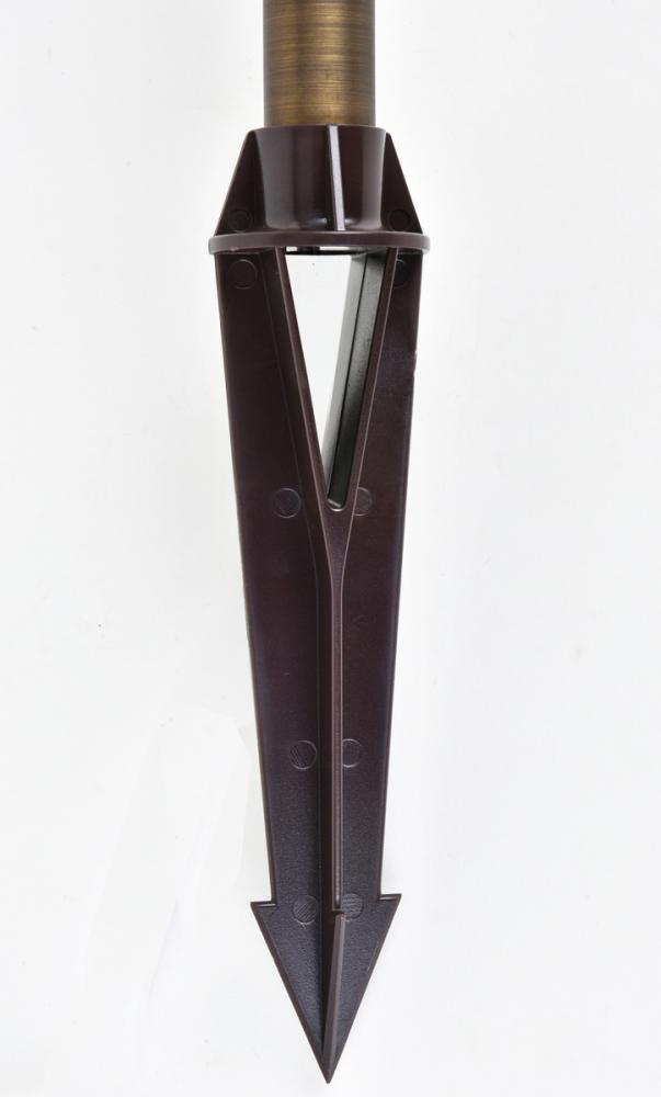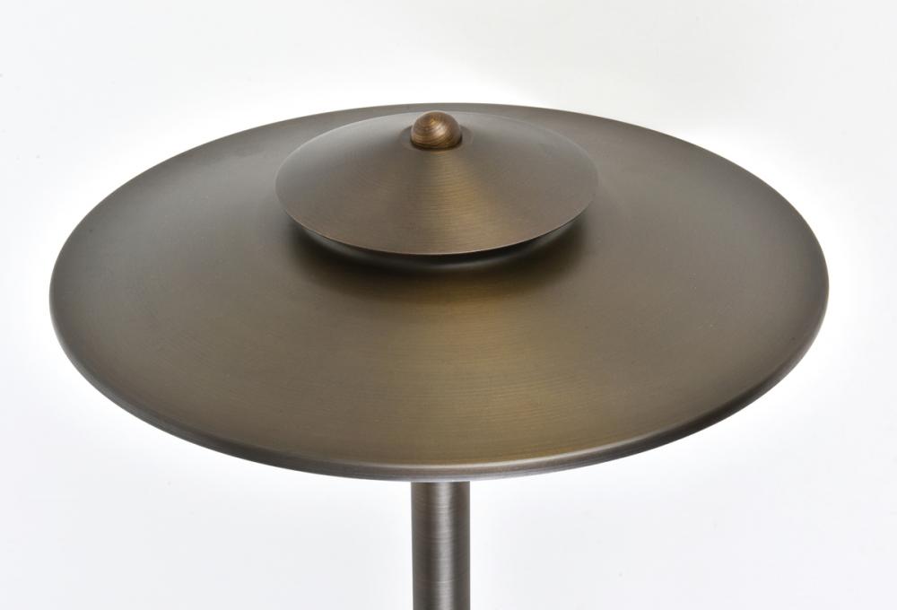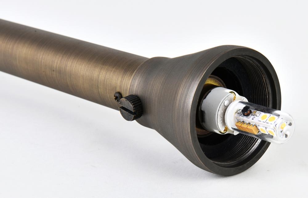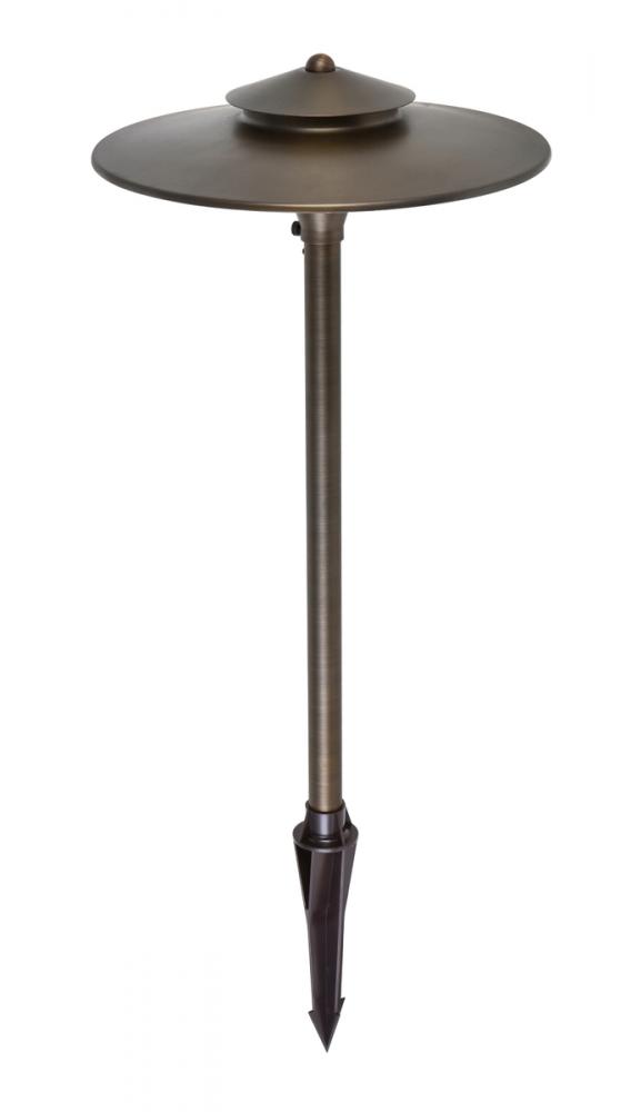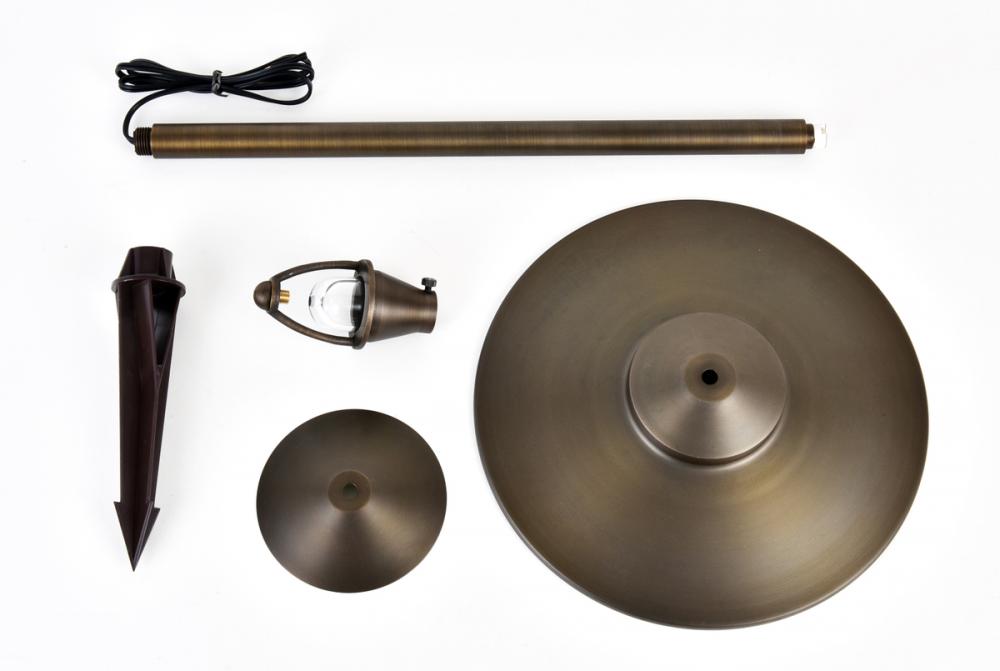 Inspired by the species of brightly-colored mushrooms, Chanterelle path lights create the perfect mood lighting for your evening stroll. The spinning brass frame in an antique-brass finish features an eight-inch spike for stability. with matching brass shade, the entire fixture stands 24 inches tall and requires a 35-watt G4 halogen bulb (not included). Ideal for brightening a dark driveway, front entrance, or a garden path.