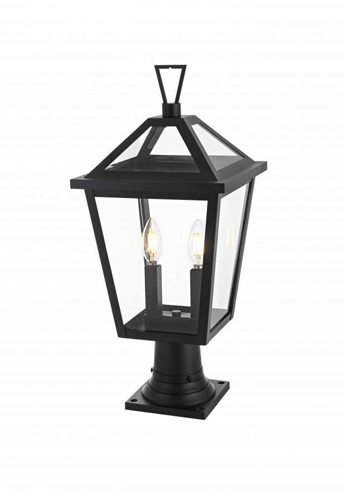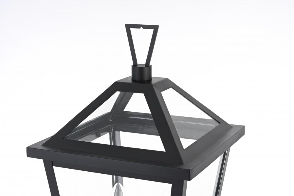 This outdoor post light is a beautiful embodiment of modern and classic design that perfectly complements any exterior home setting. Constructed from sturdy iron and clear glass, the light combines sharp architectural lines with a timeless lantern style, resulting in a statement fixture that enhances curb appeal. The angular matte black frame, topped by a stylish triangular loop, embraces an open, trapezoid-shaped structure with clear glass panels that reveal two E12 candelabra sockets. These sockets provide the ideal opportunity to incorporate flame-shaped bulbs for a warm, welcoming ambiance. Its classic look ensures versatility, making it a perfect addition to walkways, gardens, or patio posts, adding light where needed.