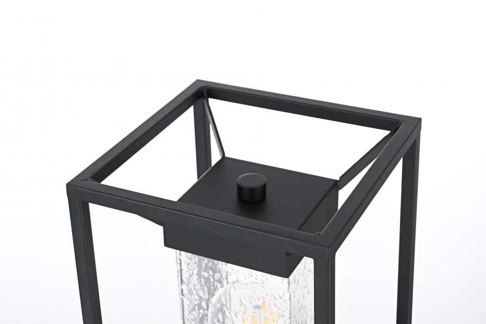 This outdoor post light blends modern simplicity with timeless charm. The sturdy iron frame is designed in a geometric shape, beautifully housing the clear seeded glass that allows the warm glow of the light to shine through. The clear seeded glass adds texture to the illumination, creating an inviting and sophisticated glow that transforms the exterior of your home. with an E26 socket base that easily accommodates standard bulbs, this fixture not only provides style but also high functionality. Whether flanking your front door or lighting up your patio, this post light elevates your outdoor space with a crisp, contemporary look that is both durable and refined.