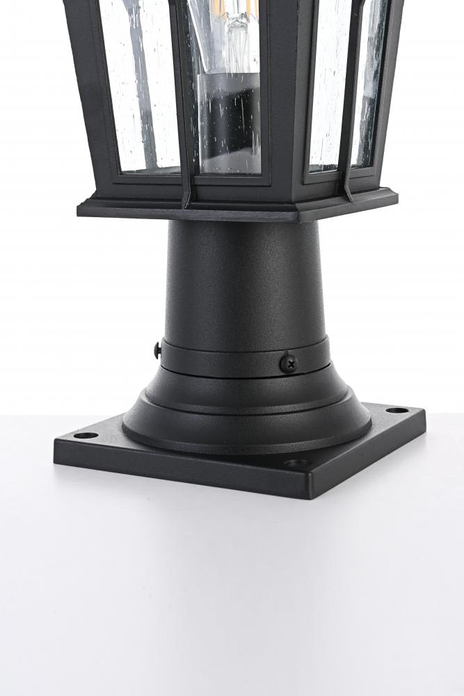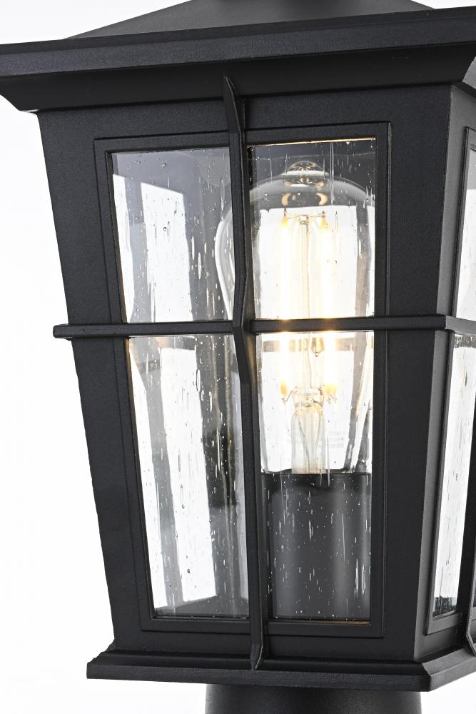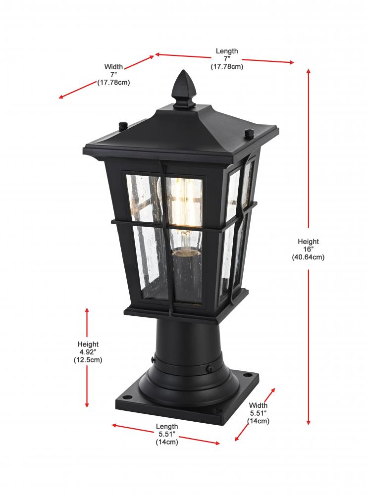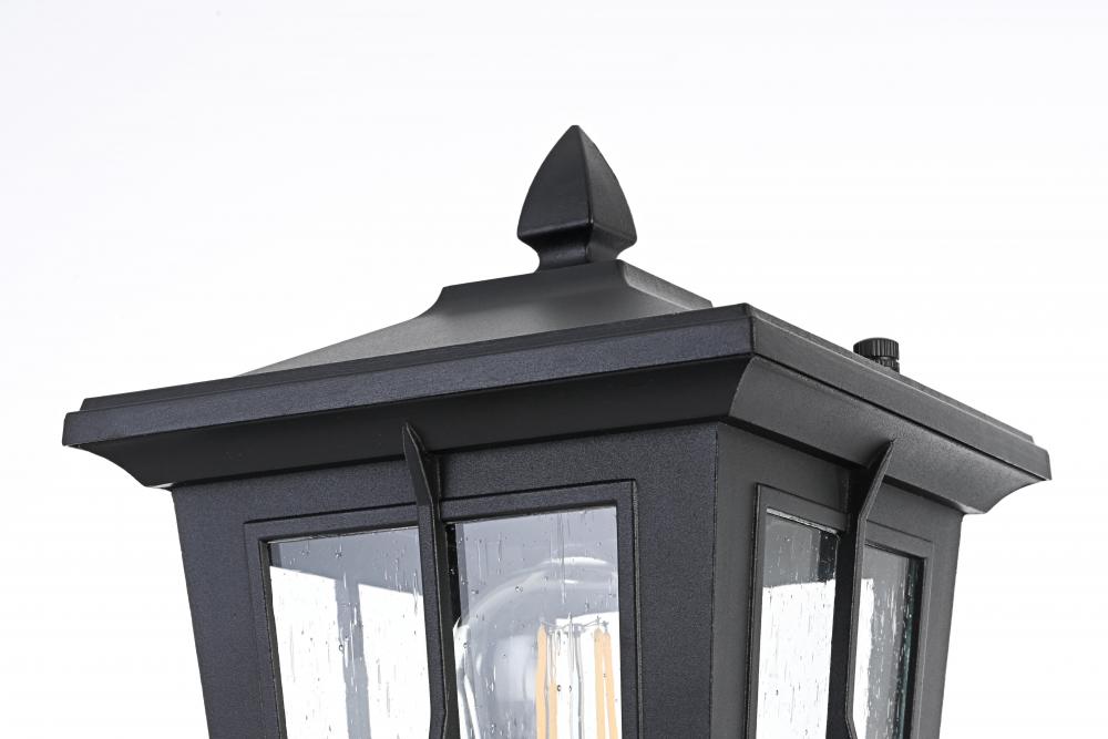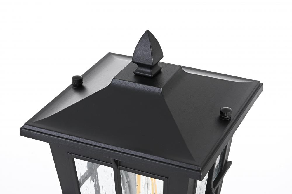 This outdoor post light is a striking blend of classic craftsmanship and contemporary functionality. Crafted from durable aluminum and encased with clear seeded glass, this light is both aesthetically pleasing and highly functional. The lantern-style design, featuring a cross-hatch metal framework and peaked roof, brings a timeless charm to your home's exterior. The seeded glass panels create a lovely diffusion of light, providing a warm and welcoming ambiance. with an E26 socket base, this light allows for versatile bulb options, adding further to its adaptable design. This post light seamlessly blends with various architectural styles, making it perfect for any outdoor area—from the front porch to backyard patios.