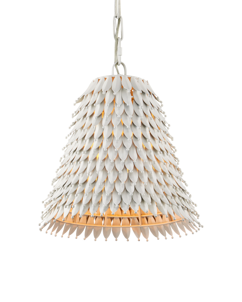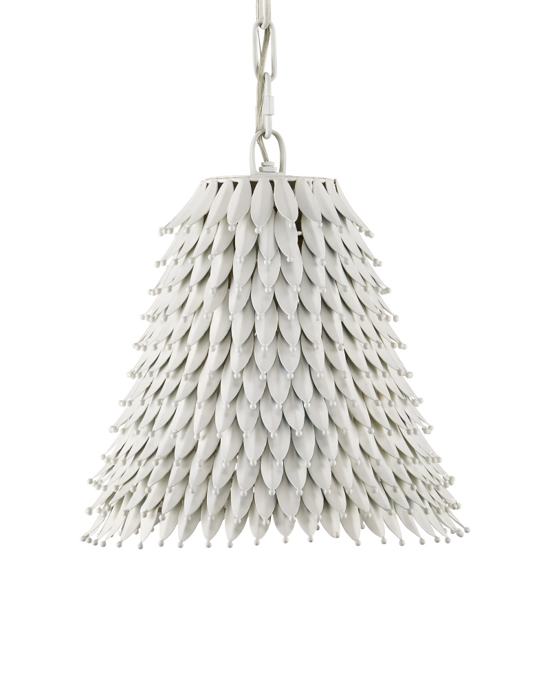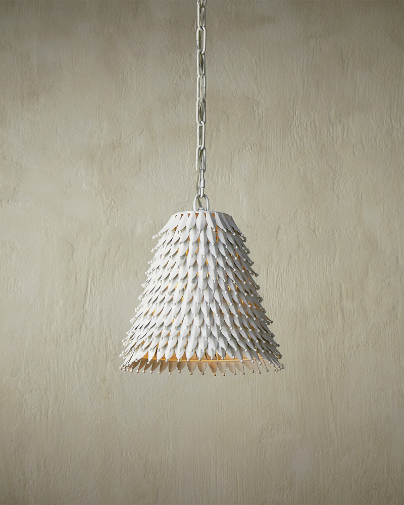 The Overlay Small Pendant is a artisanal creation that is painstakingly made by hand, as each of the leaves are individually cut and welded to the frame and the dots on the edges of the spiky cut-outs are welded on. The bell shape of the white pendant has a sartorial feel thanks to the textural richness of the fluted edges flowing downward like a couture wedding dress might. Adjustable from 19.5" to 87.5" with use of included chain/rod kit/cable. If your space calls for a longer drop, additional chain/rods/cable is available for purchase.