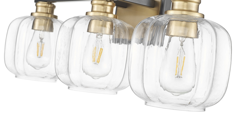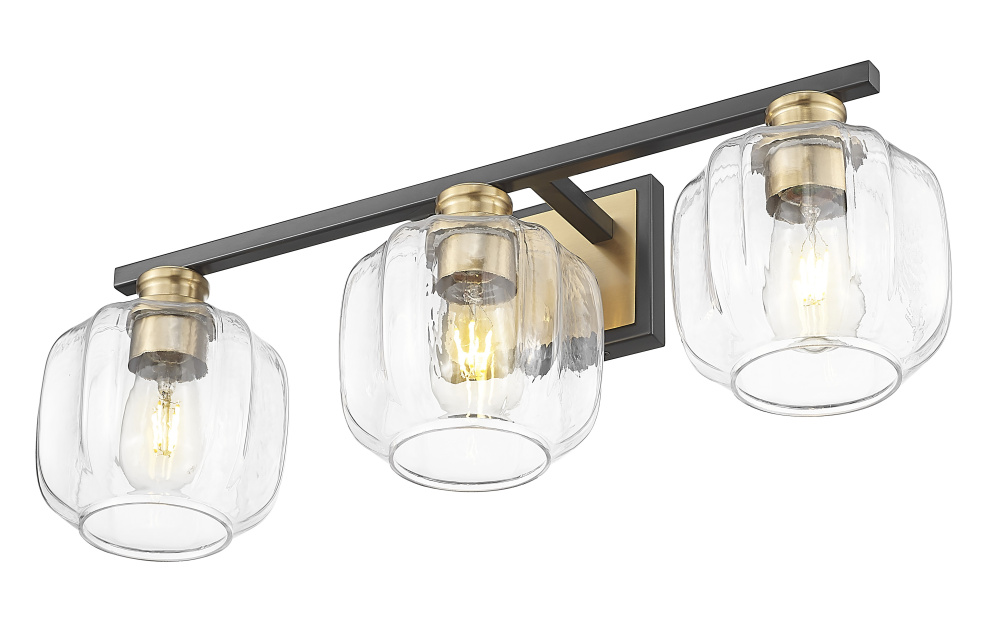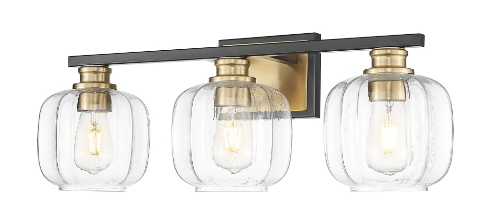 Illuminate your decor style with this three light Oxley bath fixture from Acclaim Lighting. The design features a mixed metals finish in black and brass. Curved clear glass adds dimension to the look. Stylish and sophisticated, the design is ideal for bath and vanity areas.