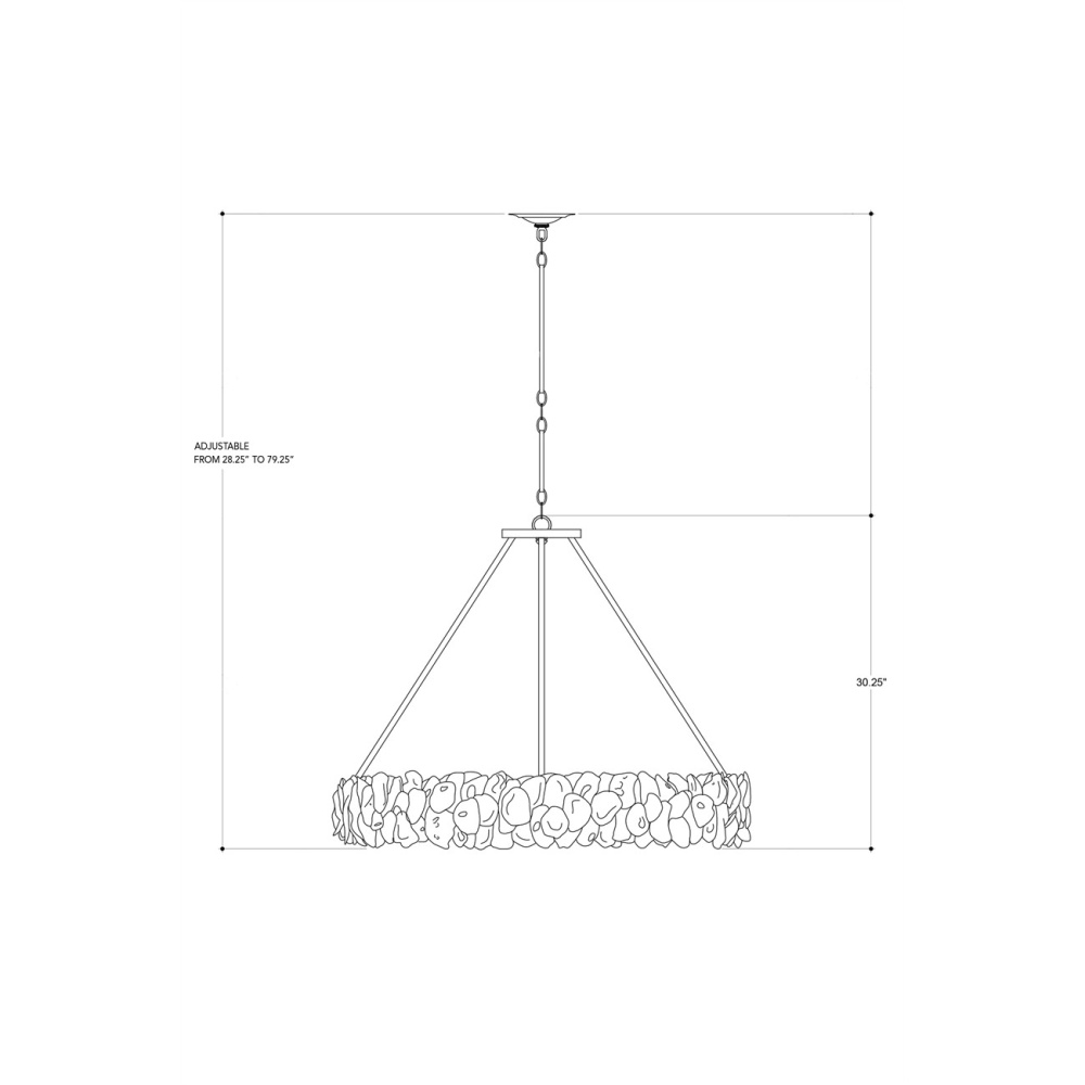 Our Oyster Chandelier with its ring of natural oyster shells bursting with seaside tones and textures has a robust charm. The simplicity and rusticity of the wrought iron frame in a textured bronze finish make this shell chandelier a bold centerpiece. Adjustable from 35.25" to 79.25" with use of included chain/rod kit/cable. If your space calls for a longer drop, additional chain/rods/cable is available for purchase.