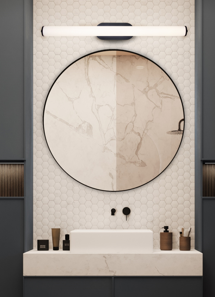 Sleek Modern Design – This LED Vanity Light features a striking black finish and glossy white ribbed glass, creating a clean, contemporary look. Its bold yet minimalist design effortlessly enhances modern and coastal-inspired bathrooms.