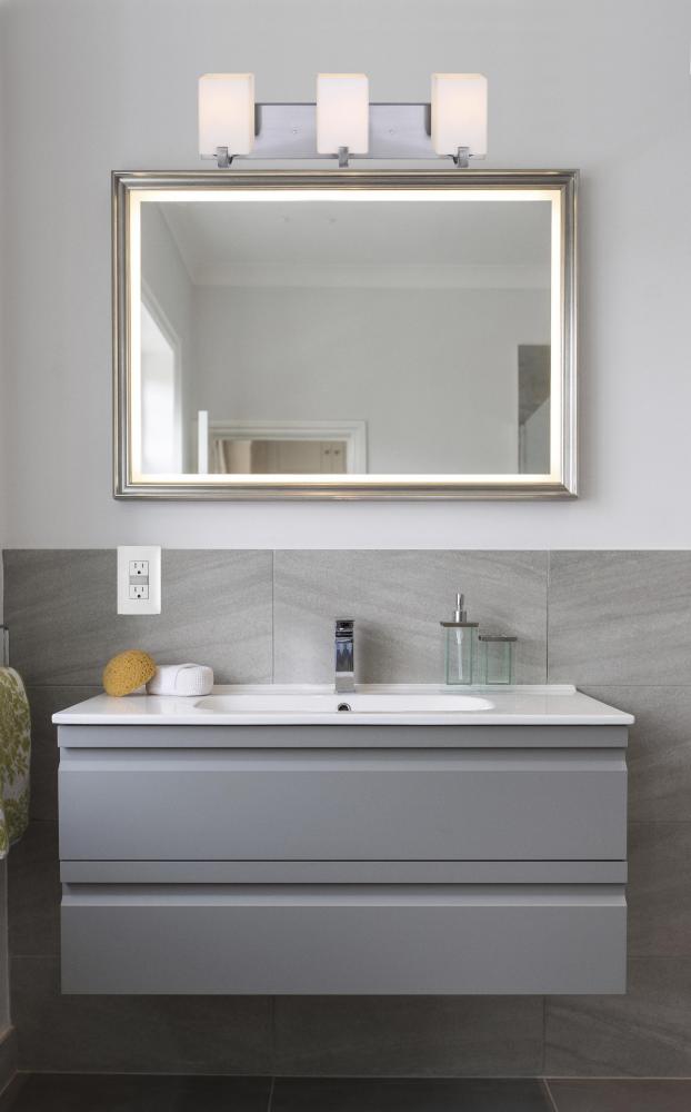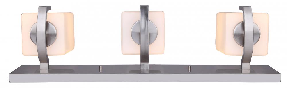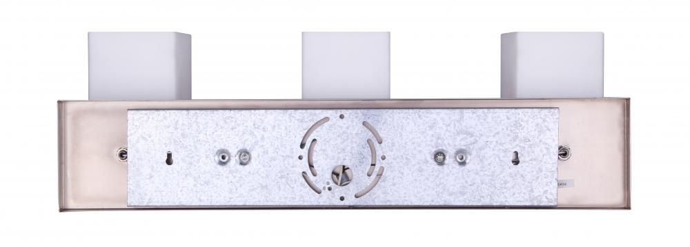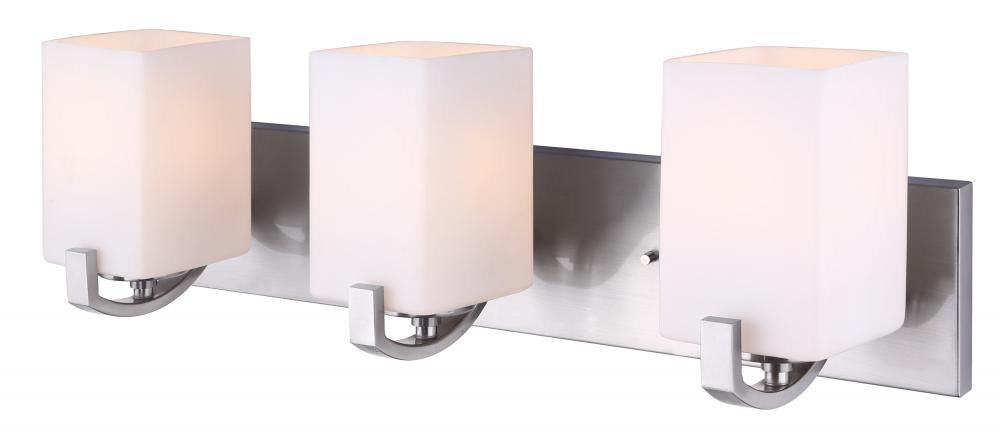 Palmer 3 Light Vanity, Nickel Finish - The Palmer 3 Light Vanity is a testament to modern elegance and functionality. Featuring a Brushed Nickel finish and Flat Opal Glass shades, this vanity light is perfect for bathrooms. Its Easy Connect feature ensures hassle-free installation, blending form and function seamlessly.