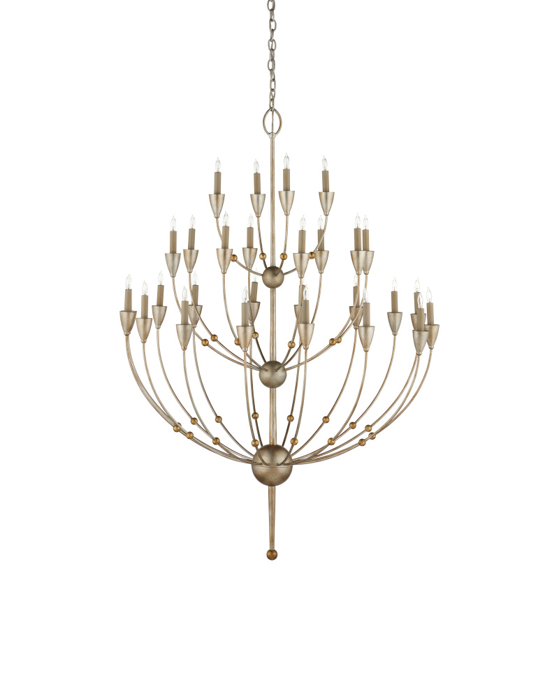 The Paradox Chandelier is a three-tiered silver chandelier with clusters of slender wrought iron arms reaching up toward wooden candle cups. The prevailing silver leaf finish brings this 28-light fixture a very modern feel, while the tiny gold-leaf globes that stud the arms bring a contrasting warmth. Adjustable from 68" to 135" with use of included chain/rod kit/cable. If your space calls for a longer drop, additional chain/rods/cable is available for purchase.
