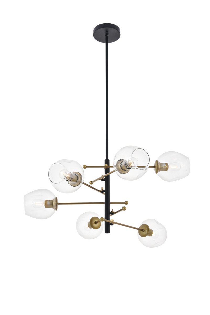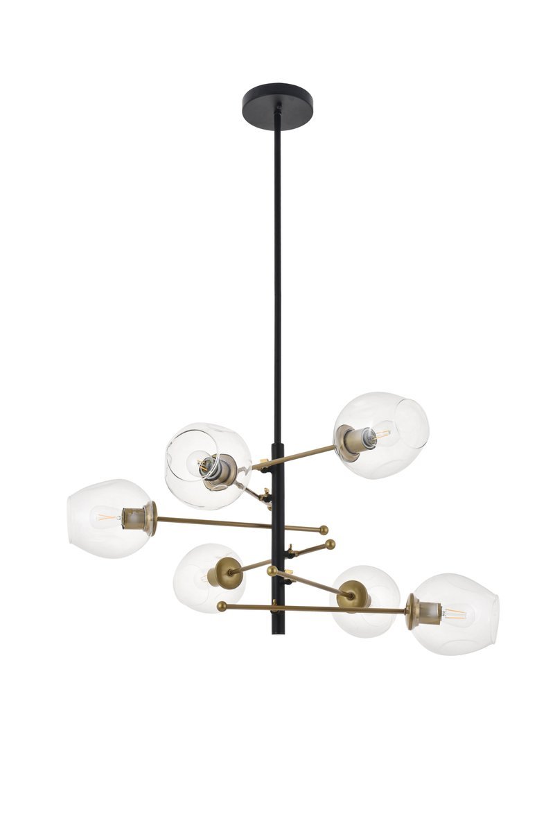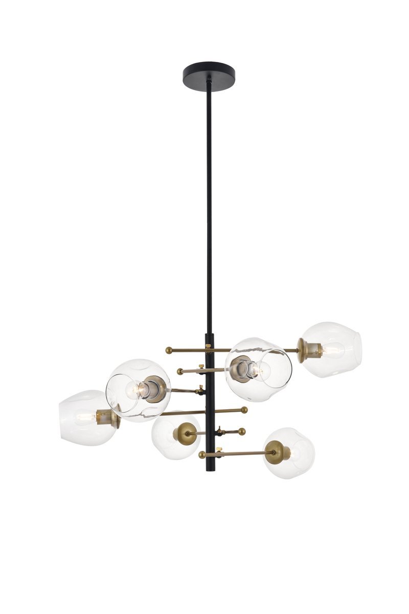 The Paragon collection pendant lamp in a brass and Mattee black will surely be the champion of your house by vanquishing the darkness from all corners of your home with the 6 lights that faces many directions. Its excellent style is defined by the black rod that hangs, and the six brass rods that supports a light each, creating a unique and functional design. The perfect light for any modern day home, have this greet your guests in the foyer, watch over your family in the living room, or have an interesting centerpiece in your dining room