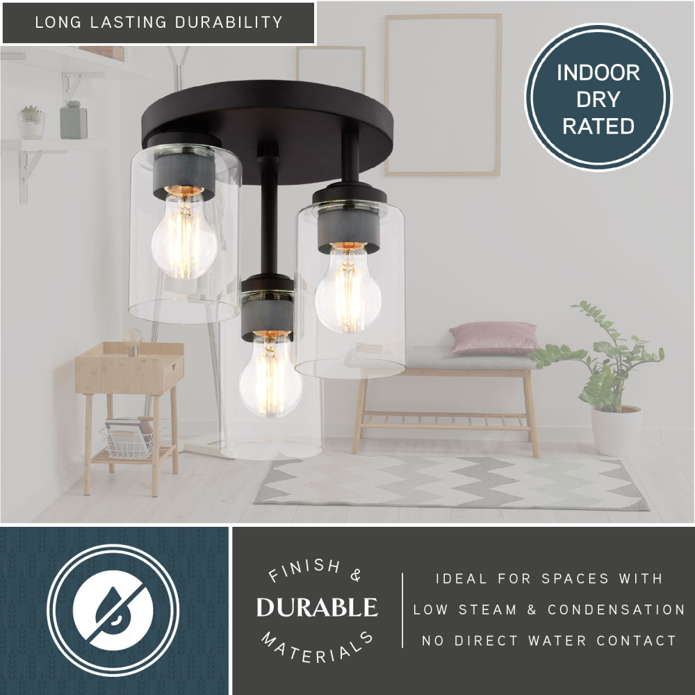 Bring a touch of minimalist sophistication to your bathroom with the Park Ridge 3-light flush mount. Its striking asymmetric design, featuring clear cylindrical glass shades at varying heights, creates a captivating focal point in any room. The matte black finish complements both transitional and contemporary styles, adding a sophisticated edge to your decor. This ceiling fixture provides ample, balanced illumination, perfect for hallways, entryways, or living areas, making it an ideal upgrade for the style-conscious homeowner.