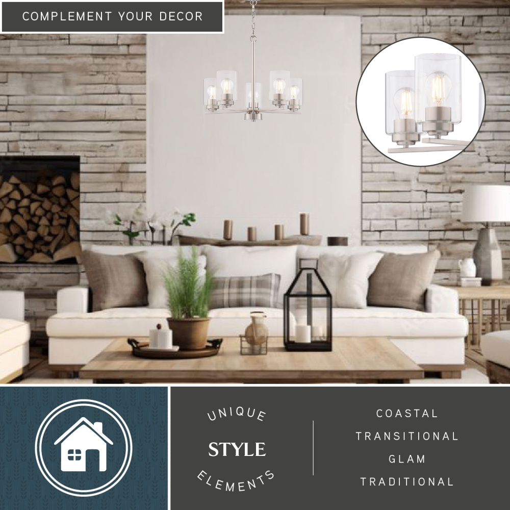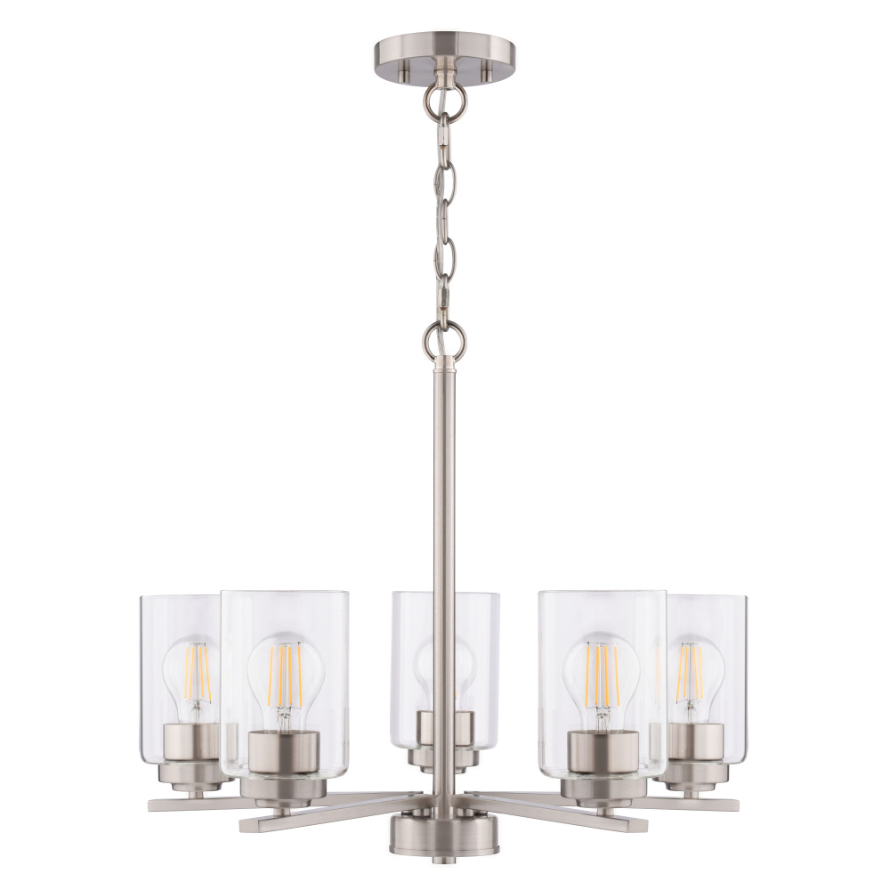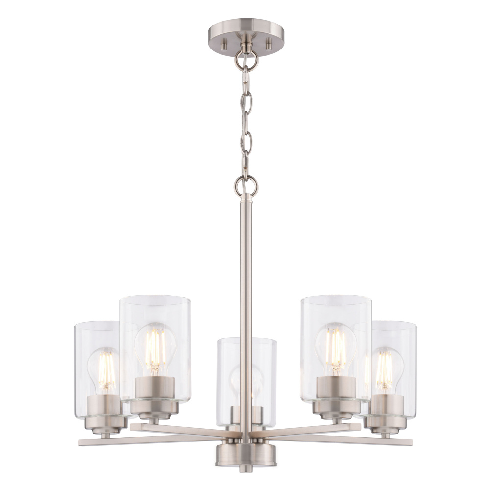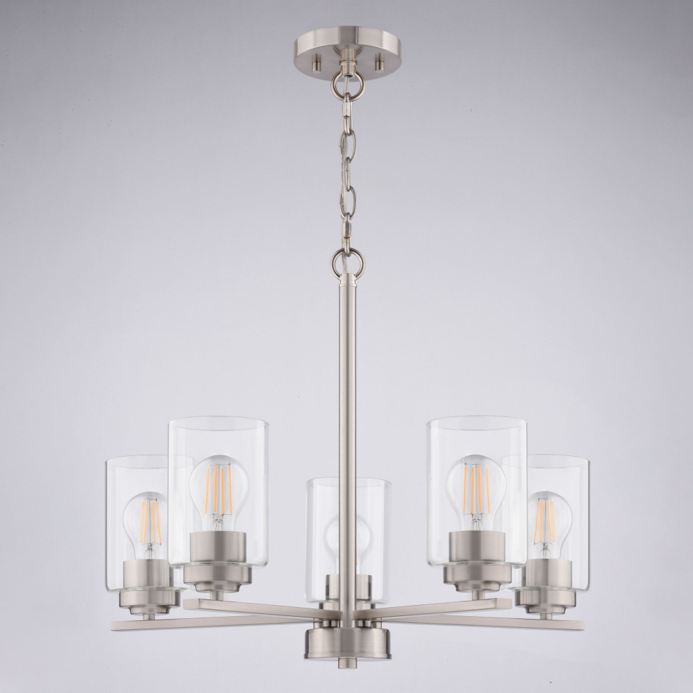 Elevate your dining or living space with the understated elegance of the Park Ridge 5-light chandelier. Its classic linear silhouette, featuring five clear cylindrical glass shades, casts a bright, inviting glow, perfect for both intimate gatherings and everyday moments. The satin nickel finish and adjustable chain suspension seamlessly blend modern and transitional styles, offering versatility to complement any decor. This ceiling light fixture provides ample, balanced illumination, transforming your gatherings into memorable moments allowing for an effortless style upgrade.