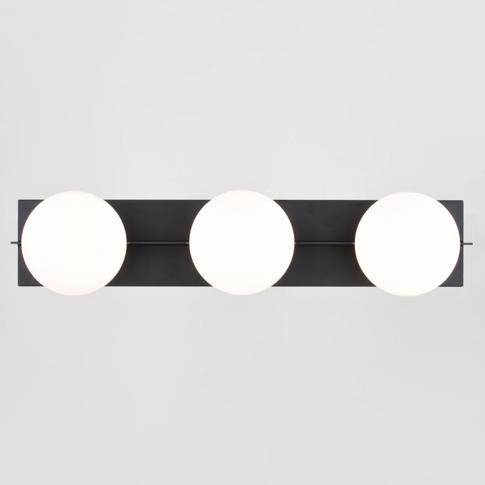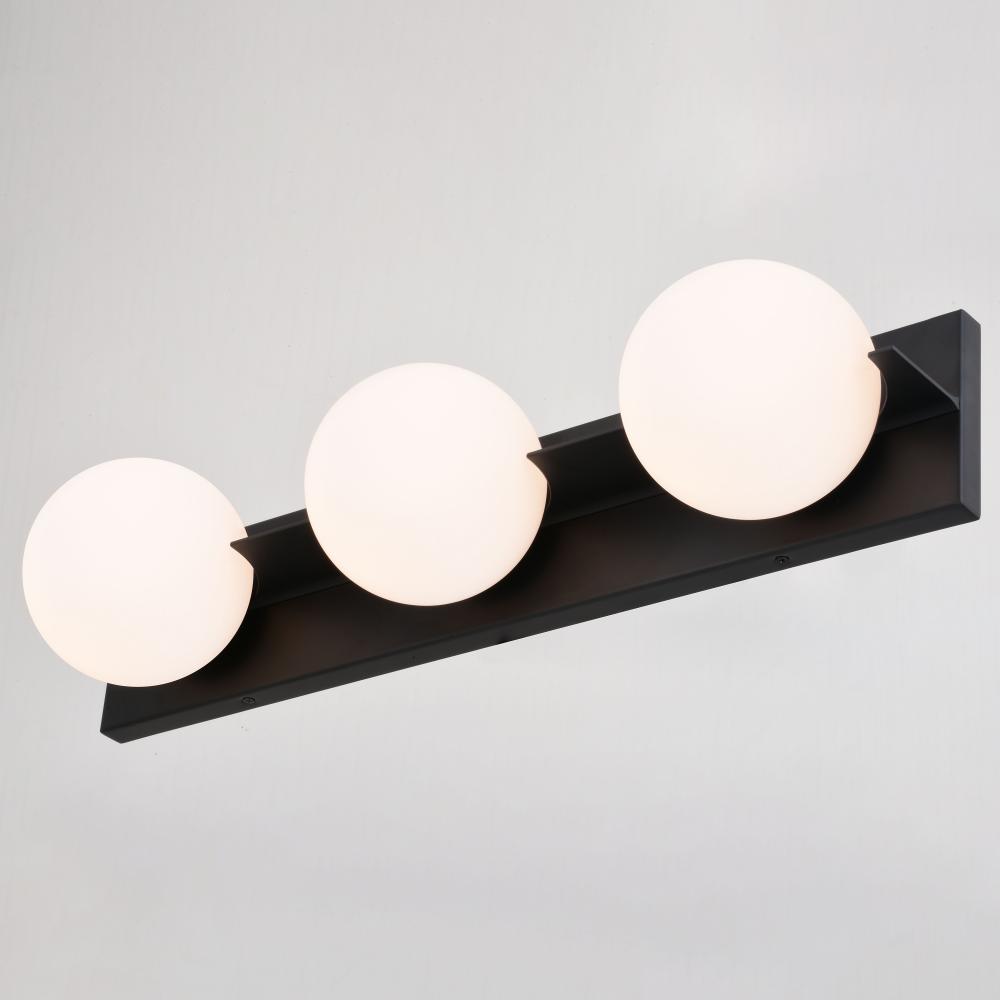 Inspired by mid-century modern art with contrasting geometric shapes, the Parkview collection blends both form and function beautifully. The shades seem to float over the large rectangular back plate and are accentuated by the thin metal divider. This bathroom vanity wall light is finished in matte black with contrasting frosted opal glass globes. Place this contemporary piece over medium vanities, as a pair over double sinks, or vertically on either side of a mirror.