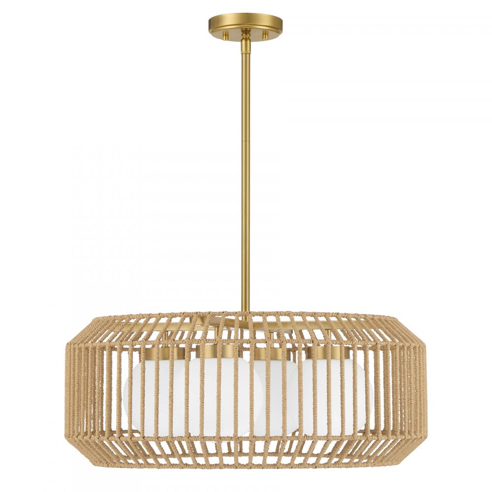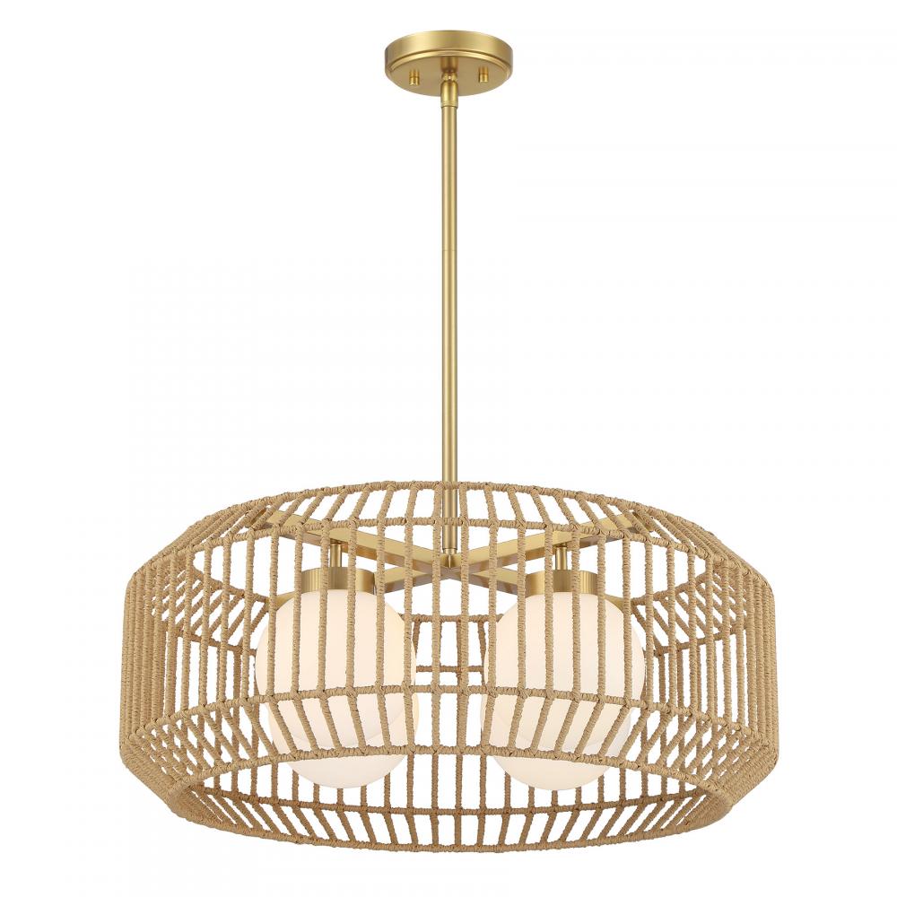 The Savoy House Pastis 4-light pendant beautifully blends a world of inspirations to create a picture-perfect lighting look. A cage-like shade is woven with natural rattan that adds terrifically touchable texture. Orbs of white glass bring a bright glow that is amplified by the Warm Brass finish. Pastis is 24" in width and has an adjustable height ranging from 9.55" to 63.5". Uses four candelabra size bulbs of up to 60 watts per bulb. Bulbs not included. Comes with four 12" downrods and one 6" downrod.