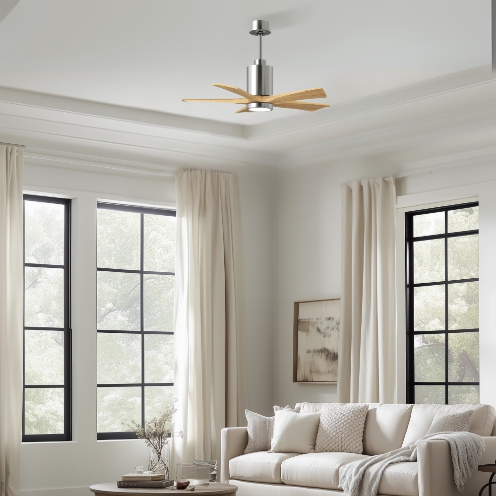 A complement to any commercial or residential space, the Patricia 5 seamlessly combines innovation with simple, refined design. Its elegant aesthetic belies its robust construction. Solid wood blades revolve around a balanced, cylindrical DC motor housing. Air is circulated efficiently with barely more than a whisper. An eco-conscious LED light kit completes the package, making Patricia 5 sophisticated, efficient and green.