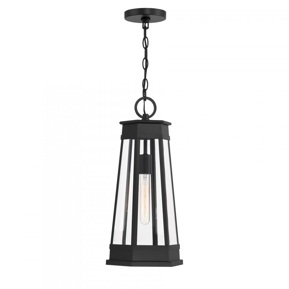 Light the way home with the terrific transitional style of the Savoy House Payne 1-light outdoor hanging light. It has standout style thanks to panes of clear beveled glass, thoughtful geometric detailing and a versatile Matte Black finish. Use it solo or in groupings to create a great first impression. Payne is 21.25" in height and 9.5" in width. Uses one standard size bulb of up to 60 watts. Bulb not included. Payne is damp area rated for use in covered outdoor areas.