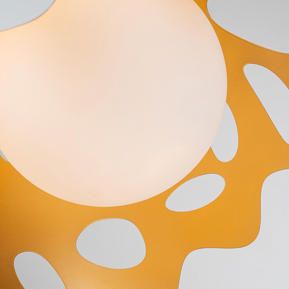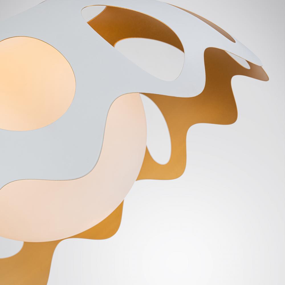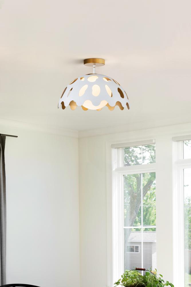 Pebbles 15" Pendant in White with gold interior. Unique cutouts enhance a frosted glass globe for clean down light. Adjustable for pendant or flush mount versatility.