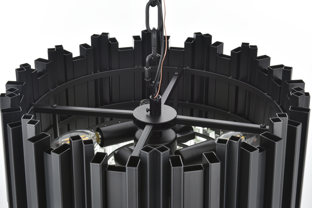 The black finish adds depth and drama, accentuating the geometric lines and creating a bold focal point.
