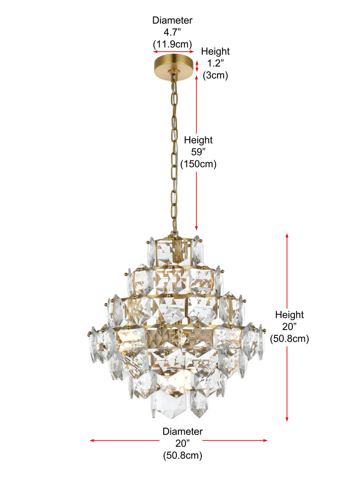 Transform your space with this cascading multi-tier pendant light that combines striking design with meticulous craftsmanship. Crafted from a sturdy iron frame and adorned with six-sided faceted crystals, this lighting piece exudes charm through its ability to diffuse light into a soft, radiant glow. With finishes available in both sleek chrome for a contemporary feel and satin gold for a warmer, refined touch, it complements a range of decor styles. The adjustable height, from 29 inches to 89 inches with the included 59-inch chain, ensures it fits seamlessly in any setting. Equipped with eleven E12 sockets and dimmable functionality, you can customize the lighting to suit your mood or occasion. Its matching canopy and chain finish complete the cohesive design, making it perfect for kitchens, dining rooms, living rooms, or offices. A statement piece that transforms your space into a work of art, this pendant is the perfect blend of style and functionality.