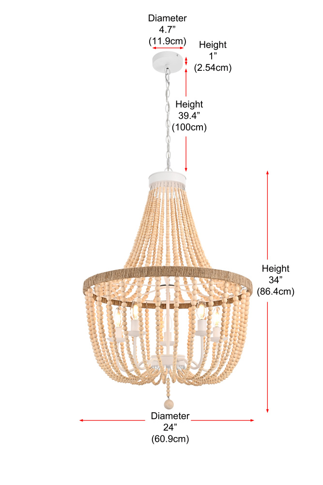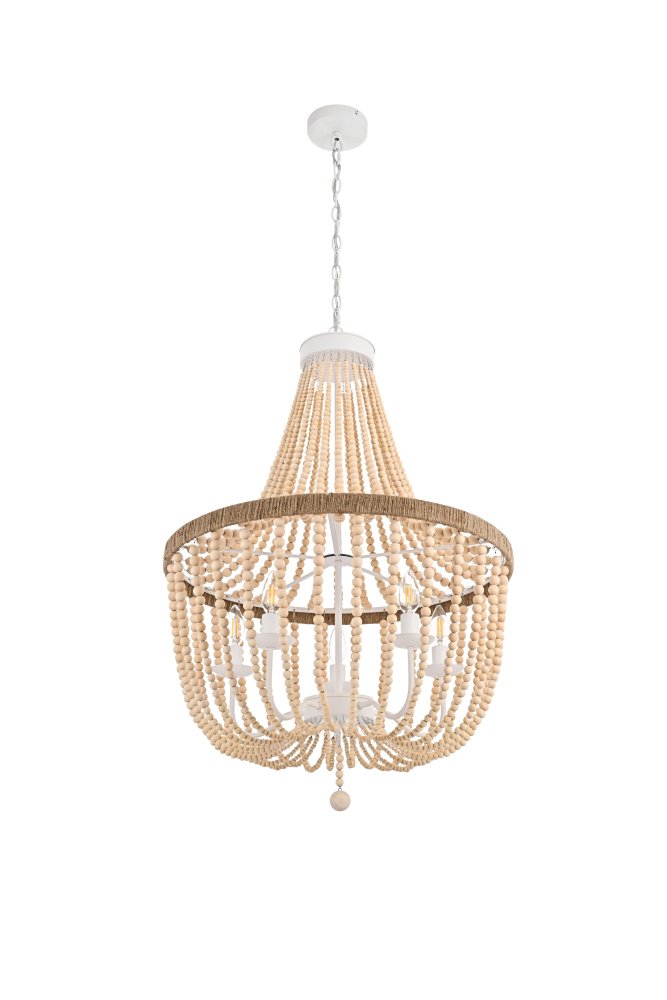 Elevate your space with this masterfully crafted pendant that artfully blends rustic charm with refined elegance. The dramatic cascading strands of wooden beads create a mesmerizing display of light and shadow, while the rope-wrapped crown adds an authentic touch of artisanal craftsmanship. Each piece showcases the natural beauty of carefully selected wooden beads, arranged in graceful loops that draw the eye upward and create a sense of gentle movement. The substantial iron framework ensures stability while maintaining an airy, elegant presence. Perfect for dining rooms, entryways, or living spaces, this versatile fixture adapts beautifully to various ceiling heights through its adjustable chain system. The three-light design provides ample illumination while creating enchanting patterns through the beaded strands. Whether styled in sophisticated antique white or warm natural beige, this pendant makes a striking statement while maintaining an organic, approachable presence. The thoughtful blend of materials and textures creates a piece that feels both timeless and fresh, making it an ideal choice for designers and homeowners seeking to create a space with both character and refinement.