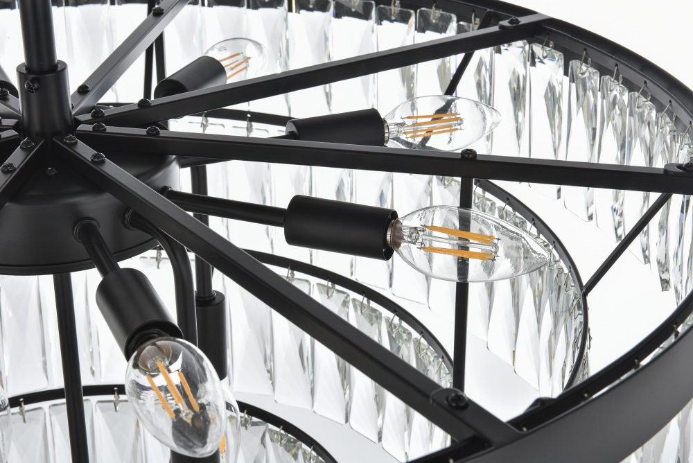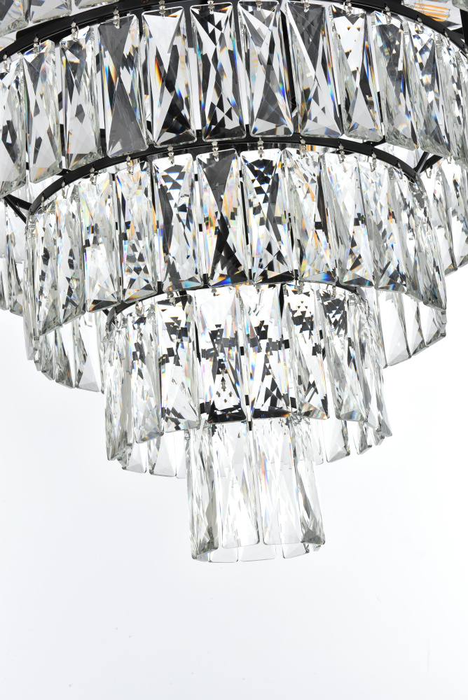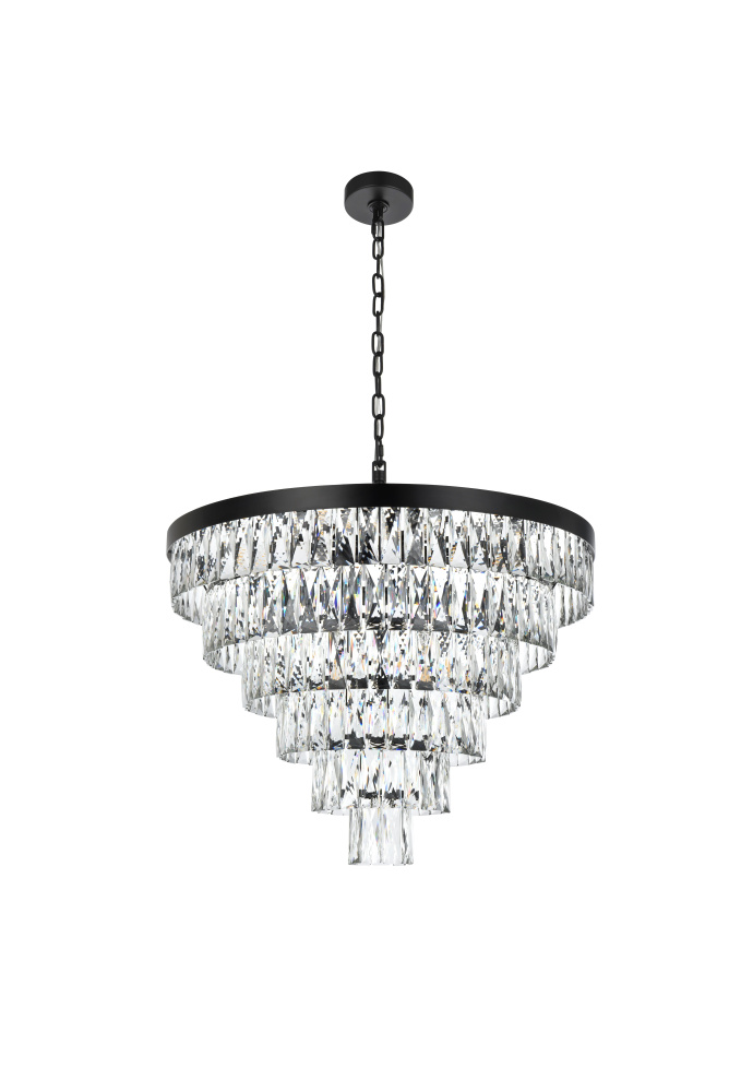 Transform your space with this extraordinary pendant that reimagines classical crystal design for contemporary interiors. The masterfully engineered silhouette features six graduating tiers that create a spectacular inverted pyramid, reminiscent of a frozen cascade captured in mid-descent. Each precisely cut rectangular crystal is strategically positioned to maximize light play, creating mesmerizing displays of fractured light throughout your space. The substantial scale makes this fixture an ideal centerpiece for grand entryways, sophisticated dining rooms, or executive offices. The thoughtful construction incorporates 13 light sources distributed throughout the tiers, ensuring both spectacular illumination and enchanting crystal animation. The robust iron framework provides a secure foundation while maintaining visual lightness, allowing the crystals to appear as if floating in space. Available in reflective chrome, sophisticated black, or warm satin gold, this pendant makes an unforgettable statement while maintaining refined restraint. The cascading arrangement creates a sense of movement and flow, while the geometric precision of each crystal adds contemporary edge to the classical form. This is more than a light fixture – it's an architectural feature that transforms your space through its commanding presence and spectacular light performanc