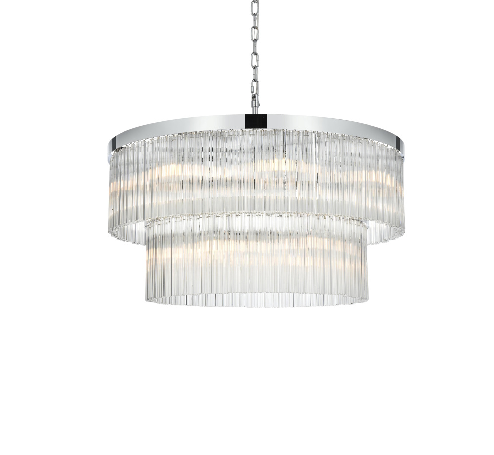 Turn your space into a glowing masterpiece with this striking pendant light, crafted from durable iron and shimmering clear ribbed glass. The cascading layers create a stunning interplay of light and shadow, refracting illumination into a radiant display that transforms your space into an illuminated work of art. Available in chrome for a sleek, contemporary aesthetic, black for bold contrast, and satin gold for an inviting warmth, this pendant light is as versatile as it is beautiful. Whether you choose a single tier for minimalist charm, two tiers for balanced depth, three tiers for bold presence, or four tiers for show-stopping grandeur, there’s an option for every setting. Featuring both round and rectangular frame designs, this fixture adapts to any space with ease. Complete with a matching canopy and chain, and fully dimmable for customized lighting, this pendant pairs perfectly with the coordinating single-tier flush mount and wall sconce collection, ensuring a cohesive, radiant design throughout youhome or office. Please note: light bulbs are sold separately.