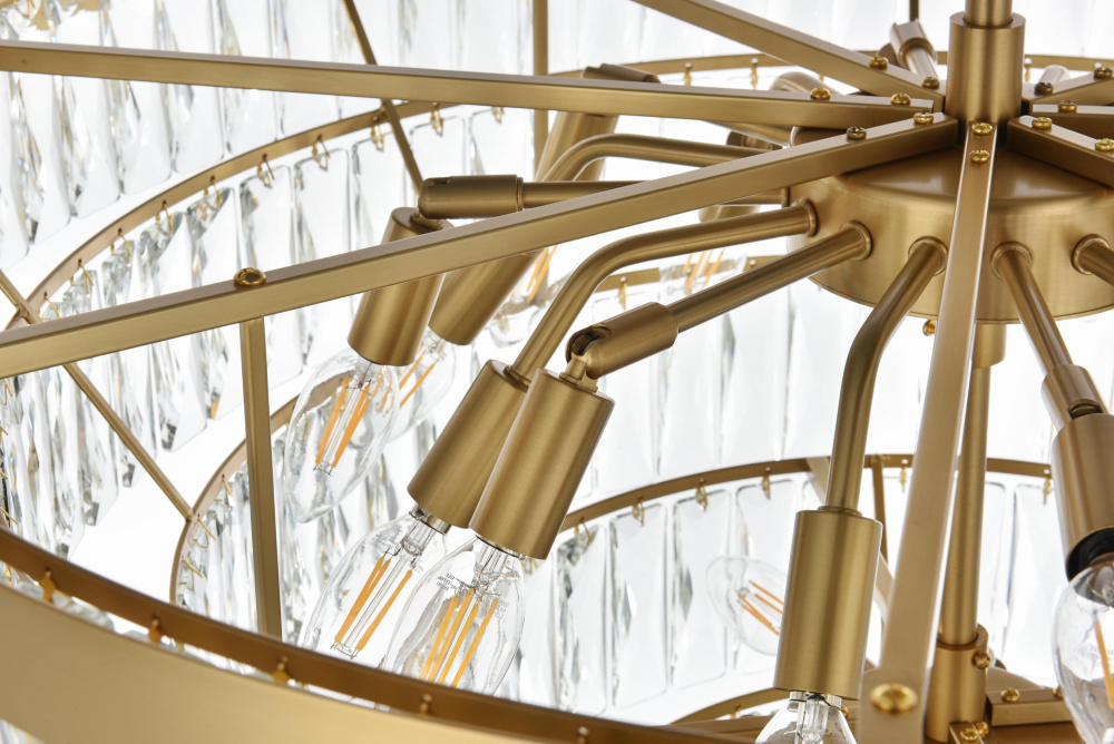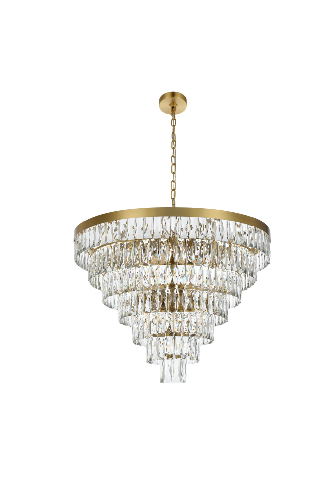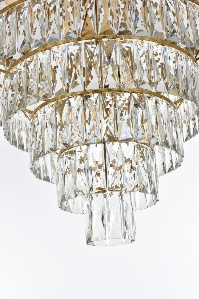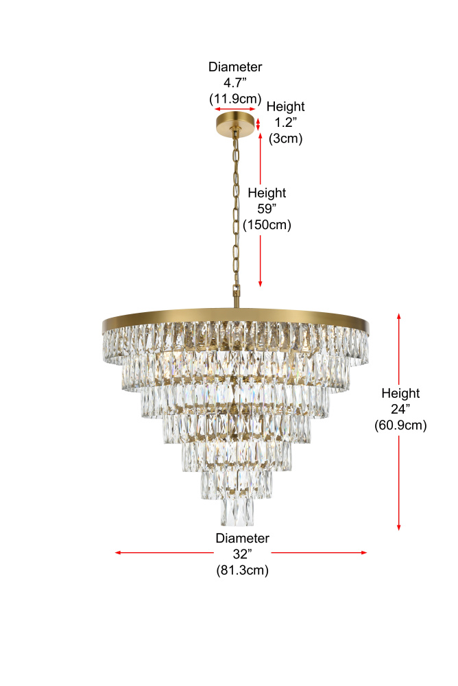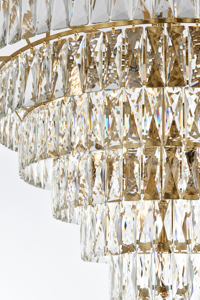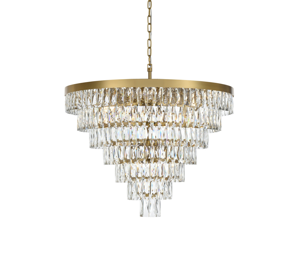 Transform your space with this extraordinary pendant that reimagines classical crystal design for contemporary interiors. The masterfully engineered silhouette features seven graduating tiers that create a spectacular inverted pyramid, reminiscent of a frozen cascade captured in mid-descent. Each precisely cut rectangular crystal is strategically positioned to maximize light play, creating mesmerizing displays of fractured light throughout your space. The substantial scale makes this fixture an ideal centerpiece for grand entryways, sophisticated dining rooms, or executive offices. The thoughtful construction incorporates 25 light sources distributed throughout the tiers, ensuring both spectacular illumination and enchanting crystal animation. The robust iron framework provides a secure foundation while maintaining visual lightness, allowing the crystals to appear as if floating in space. Available in reflective chrome, sophisticated black, or warm satin gold, this pendant makes an unforgettable statement while maintaining refined restraint. The cascading arrangement creates a sense of movement and flow, while the geometric precision of each crystal adds contemporary edge to the classical form. This is more than a light fixture – it's an architectural feature that transforms your space through its commanding presence and spectacular light performanc