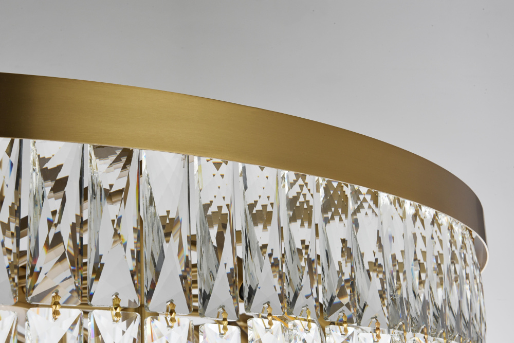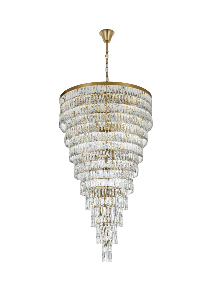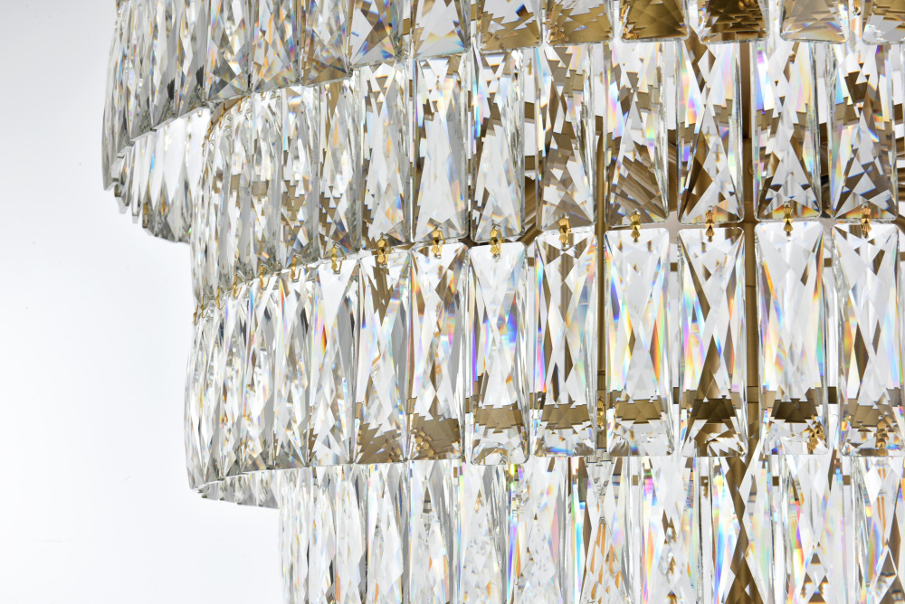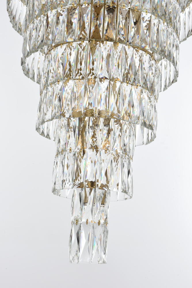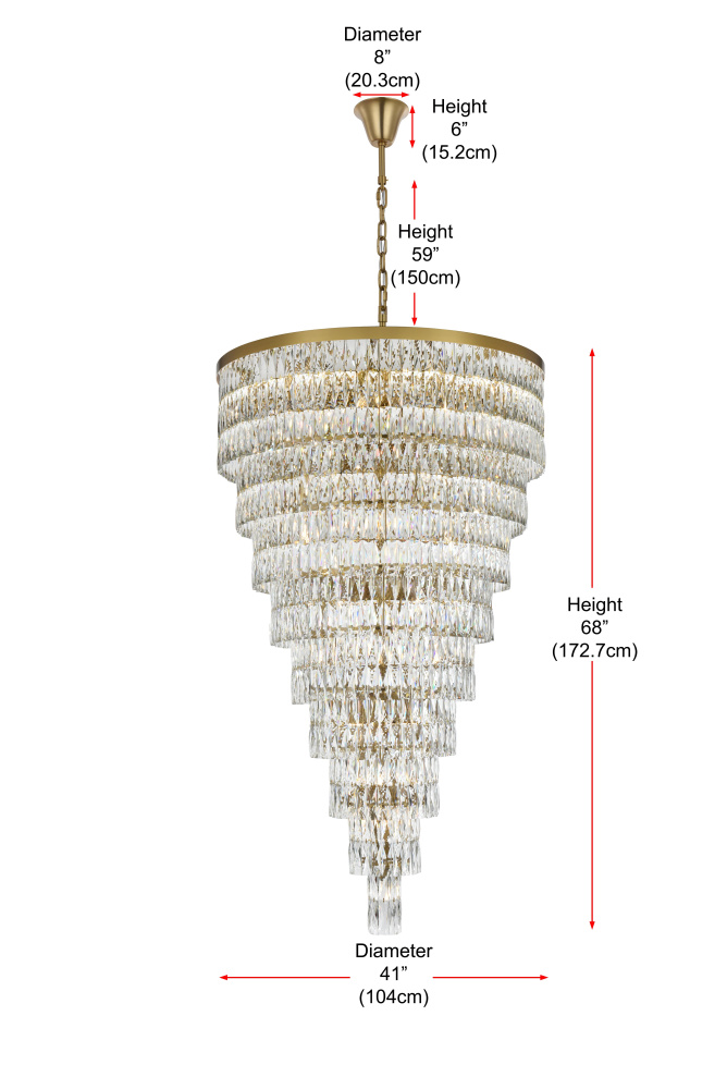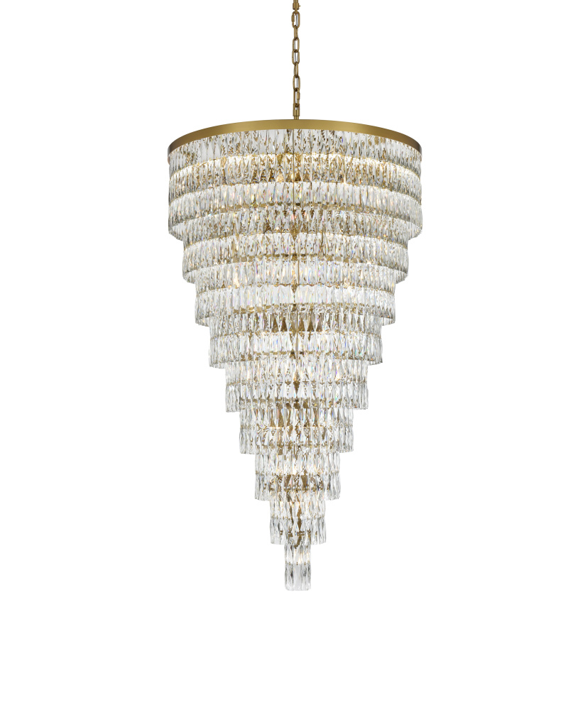 Transform your space with this extraordinary pendant that reimagines classical crystal design for contemporary interiors. The masterfully engineered silhouette features nine graduating tiers that create a spectacular inverted pyramid, reminiscent of a frozen cascade captured in mid-descent. Each precisely cut rectangular crystal is strategically positioned to maximize light play, creating mesmerizing displays of fractured light throughout your space. The substantial scale makes this fixture an ideal centerpiece for grand entryways, sophisticated dining rooms, or executive offices. The thoughtful construction incorporates 61 light sources distributed throughout the tiers, ensuring both spectacular illumination and enchanting crystal animation. The robust iron framework provides a secure foundation while maintaining visual lightness, allowing the crystals to appear as if floating in space. Available in reflective chrome, sophisticated black, or warm satin gold, this pendant makes an unforgettable statement while maintaining refined restraint. The cascading arrangement creates a sense of movement and flow, while the geometric precision of each crystal adds contemporary edge to the classical form. This is more than a light fixture – it's an architectural feature that transforms your space through its commanding presence and spectacular light performanc
