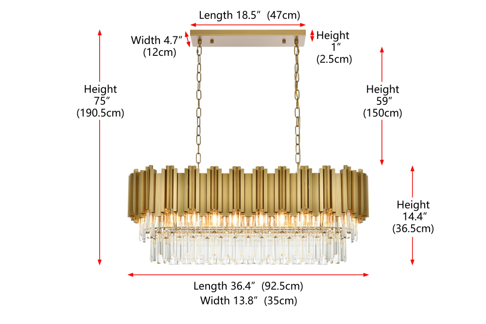 Make a bold statement with this stunning rectangular chandelier, where modern geometry meets luminous artistry. Featuring a sturdy iron frame with a staggered design and cascading clear glass accents, this fixture refracts light into a dazzling array of brilliance, creating a dynamic interplay of light and shadow. The dramatic black finish complements the shimmering glass, emphasizing the sleek, contemporary design. Perfect for dining rooms, spacious living areas, or professional settings, this chandelier transforms any space into a radiant centerpiece. Fully dimmable, it allows you to customize the ambiance to suit any occasion. Complete with a matching canopy and easy installation, this chandelier redefines modern lighting with its bold structure and captivating glow.