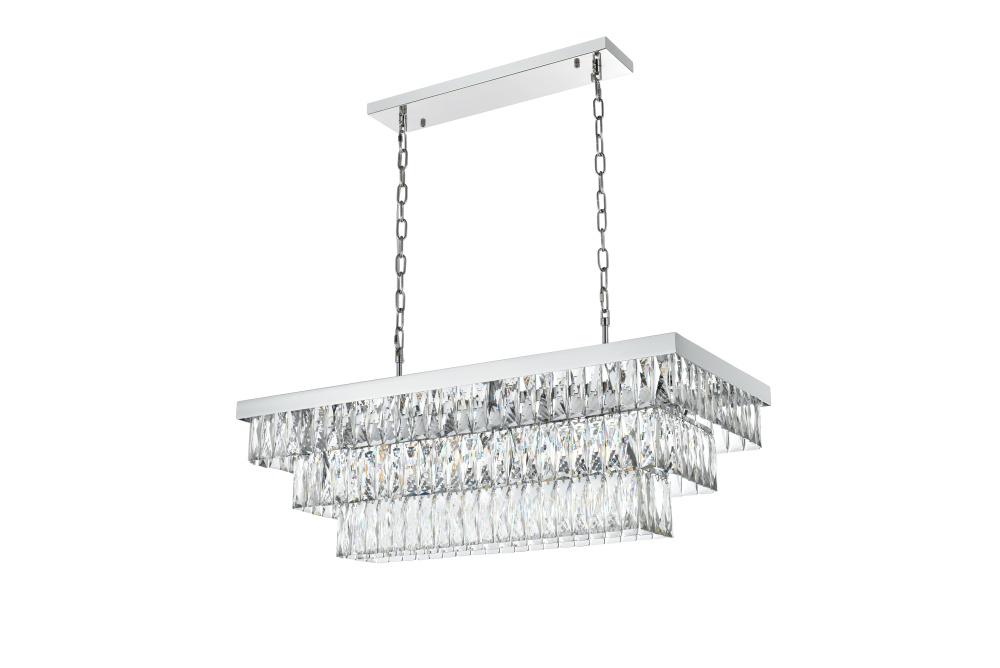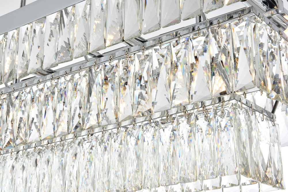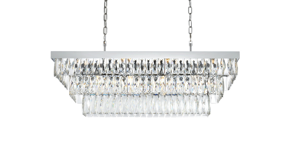 Transform your space with this spectacular linear pendant that reinvents crystal lighting for contemporary interiors. The bold rectangular frame suspends two perfectly proportioned crystal tiers, creating a mesmerizing interplay of light and structure. Each precisely cut crystal is strategically positioned to maximize light play, producing brilliant refractions that dance across your space. The strong horizontal presence makes this fixture an ideal centerpiece above dining tables, conference rooms, or in grand living spaces. The thoughtful construction marries industrial strength with crystalline delicacy, as the robust metal frame appears to float above while supporting the spectacular crystal arrangement. Whether styled in reflective chrome, sophisticated black, or warm satin gold, this pendant commands attention through its architectural presence. The linear composition offers a fresh interpretation of crystal lighting, where clean lines and geometric precision meet the spectacular light performance of premium crystal. This fixture doesn't merely illuminate – it defines space through its commanding horizontal presence while creating an ever-changing display of light and shado