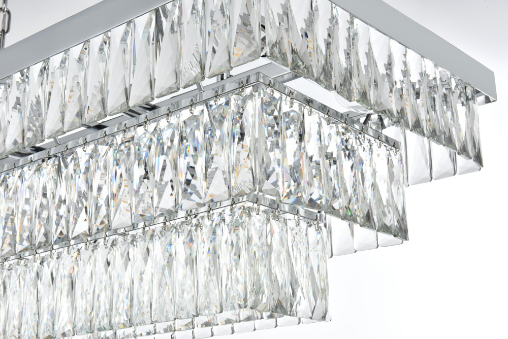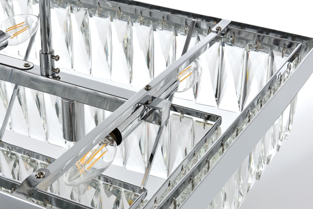 The rectangular frame creates a bold horizontal statement while crystal tiers cascade in perfect symmetry.