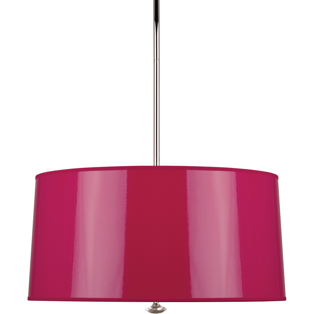 The Penelope collection draws the eye by combining polished metal, vibrant color choices, and graceful tapers. These pieces are sure to add both sophistication and visual appeal to your space. - Polished Nickel Finish Penelope Pendant with Fuchsia Ceramik Parchment Shade with Silver Mylar Lining