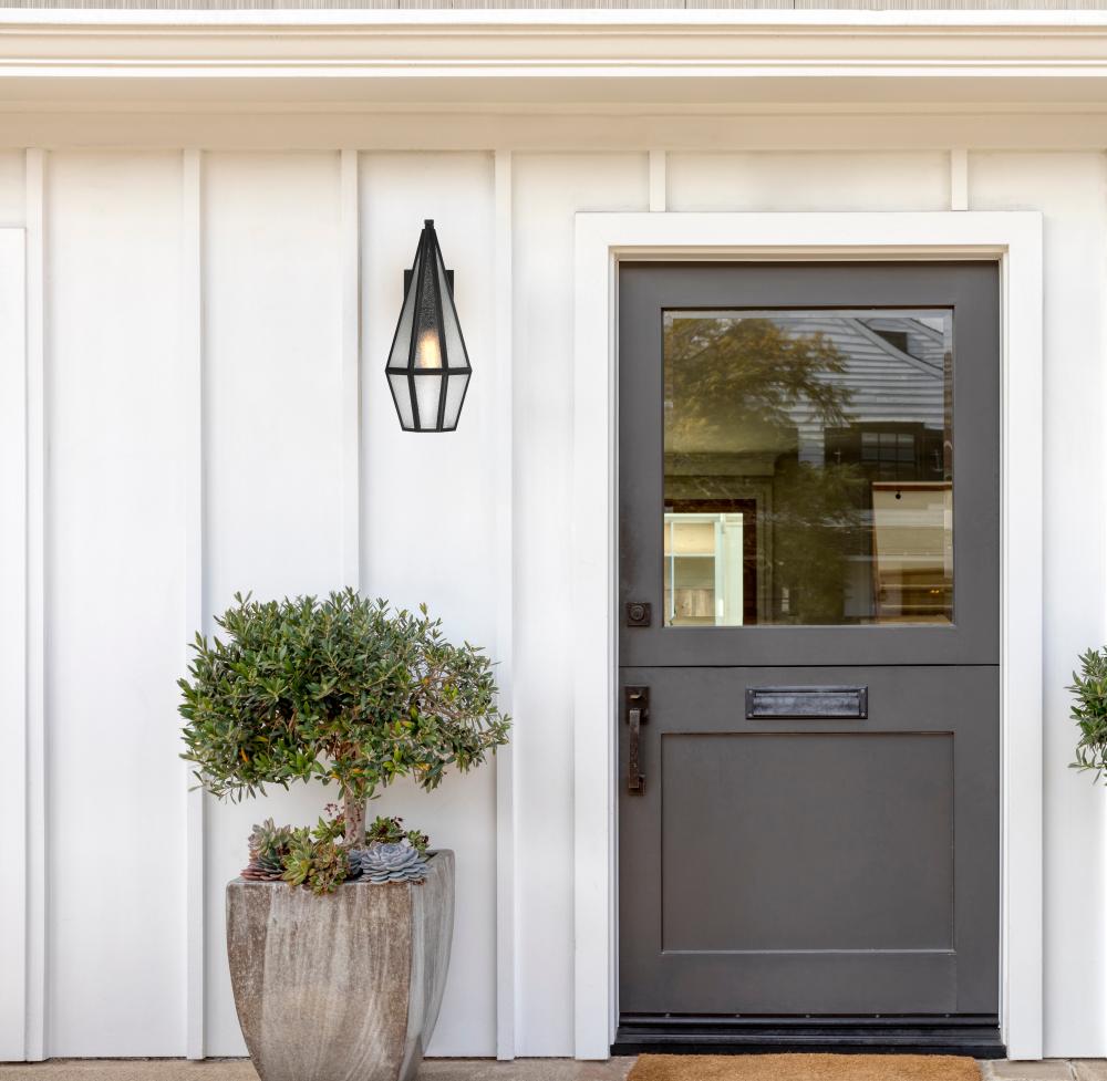 Decorate your great outdoors with the highly glamorous Savoy House Peninsula 1-light outdoor wall lantern. Its tall, slim, diamond-like design showcases panes of art glass that obscure the light within and create lots of eye-catching texture. Matte Black finish. Peninsula is 18" in height, 7.5" in width and extends 10.5" from the wall. Uses one standard size bulb of up to 60 watts. The bulb is not included. Wet area rated.