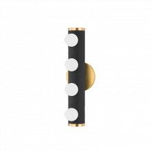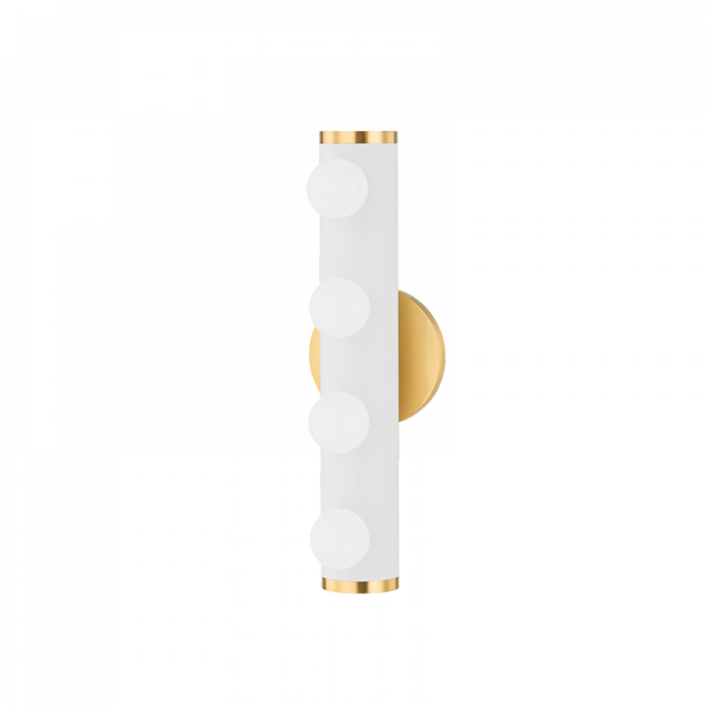 Penny gives familiar Hollywood-style lighting a fresh feel. Small opal matte globes spread across a cylinder of textured white or textured black for a glamorous look that provides ample bright light. An aged brass backplate and decorative end caps give the fixture a fun, updated look. With the ability to mount horizontally or vertically, Penny makes perfect sense over or alongside the vanity in the bath.