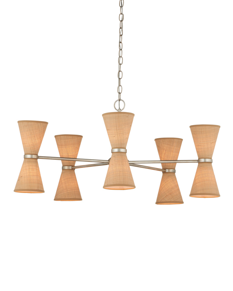 Continuing the exploration of natural materials, the Pennyworth Chandelier features shades made of grasscloth on a silver chandelier. The shades form cones that connect as they narrow and mirror each other. The wrought iron frame, finished in contemporary silver leaf, contrasts and forms a warm/cool interplay with the design. Completing the composition is a chain in a contemporary silver finish. Adjustable from 23.5" to 91.5" with use of included chain/rod kit/cable. If your space calls for a longer drop, additional chain/rods/cable is available for purchase.