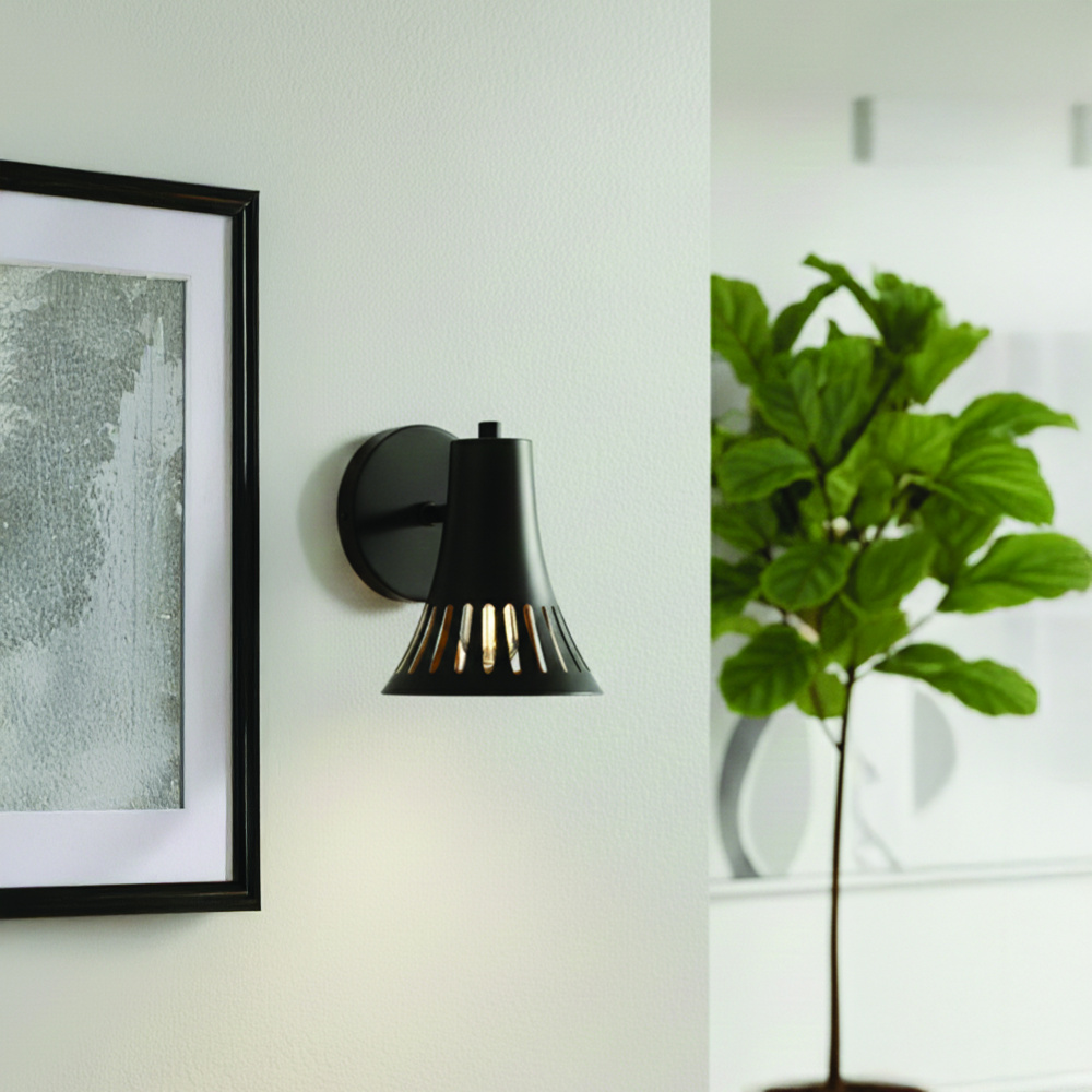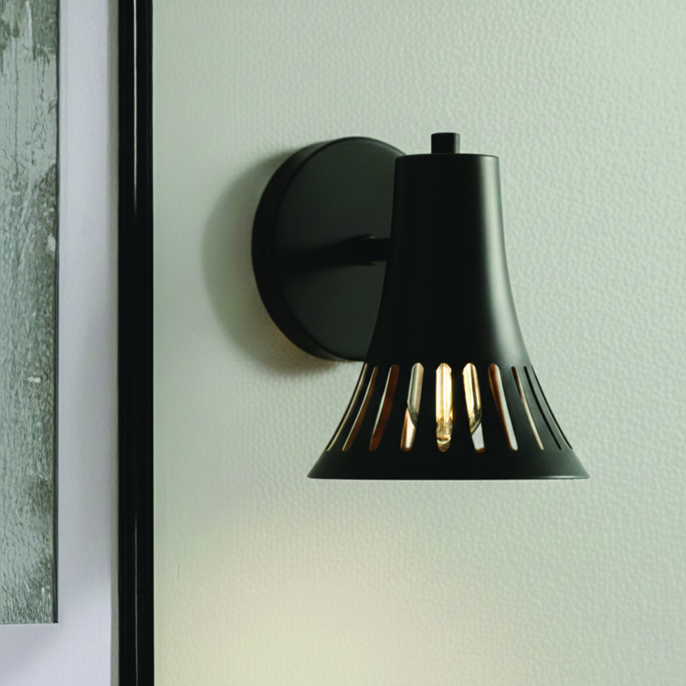 The PERCY wall light offers a sleek, modern take on classic metalwork, with its matte black shade and striking linear cut-out design. Compact at just over 7 inches tall, it delivers bold character in a minimal form, making it a versatile choice for bedrooms, hallways, or living spaces. The cut-outs allow light to play across the surface, casting subtle patterns that add depth and atmosphere. Designed for a single 60W Type A bulb, it provides reliable, functional illumination while keeping a contemporary edge. Easy Connect installation makes setup simple, combining convenience with refined style. With its clean lines and distinctive detailing, PERCY is a wall light that feels understated yet memorable.