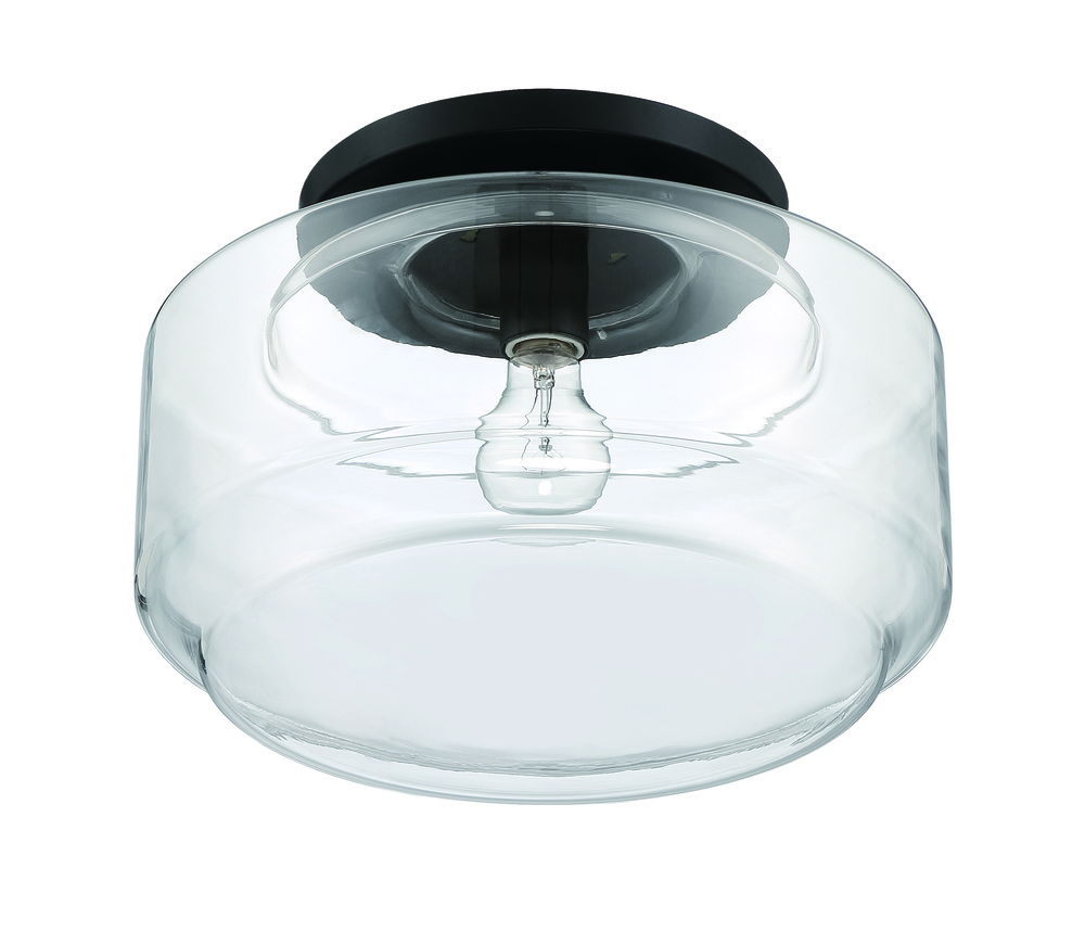 The Peri Collection , inspired by classic schoolhouse lights, features a wide clear glass globe in a familiar yet updated shape. Finished in your choice of brushed polished nickel, flat black or satin brass, these flushmounts are available in 12" and 14" diameter and each uses a single 60W medium base bulb.