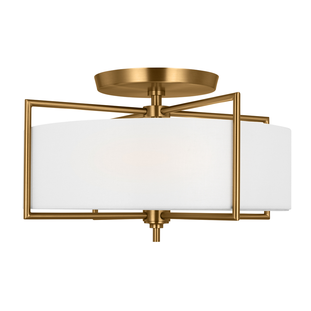 The Perno three-light flush mount in Burnished Brass by Chapman and Myers was inspired by a vintage mid-century French sconce with a simple metal armature. The minimal cruciform structure of the metal frame is the main feature of the design. The frame outlines and supports the inner cylindrical shade. All of the assembly hardware for installing the inner shade was engineered to be hidden in order to maintain the clean and simple aesthetic of the light.
