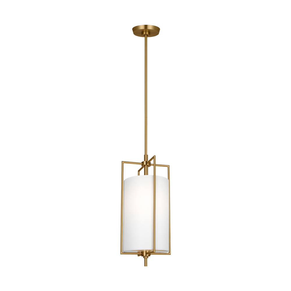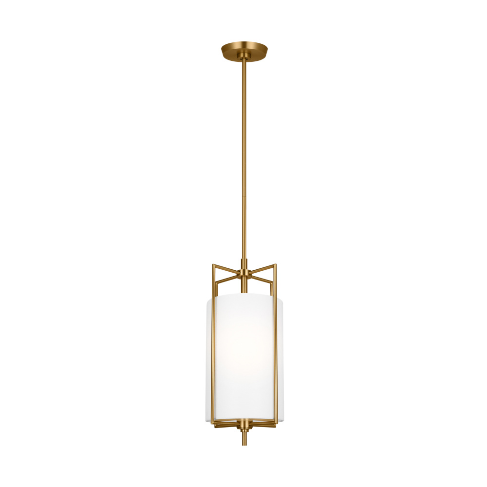 The Perno one-light shade pendant in Burnished Brass by Chapman and Myers was inspired by a vintage mid-century French sconce with a simple metal armature. The minimal cruciform structure of the metal frame is the main feature of the design. The frame outlines and supports the inner cylindrical shade. All of the assembly hardware for installing the inner shade was engineered to be hidden in order to maintain the clean and simple aesthetic of the light.