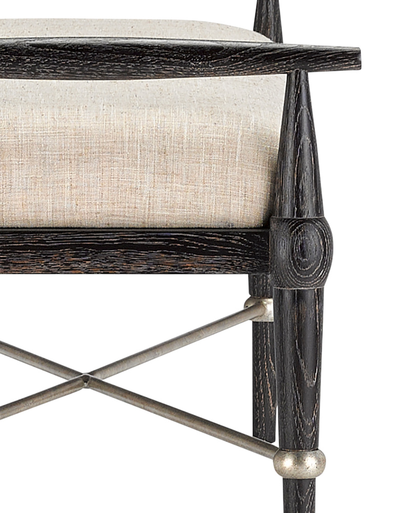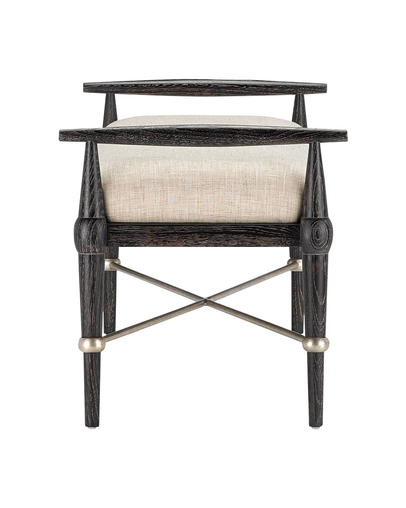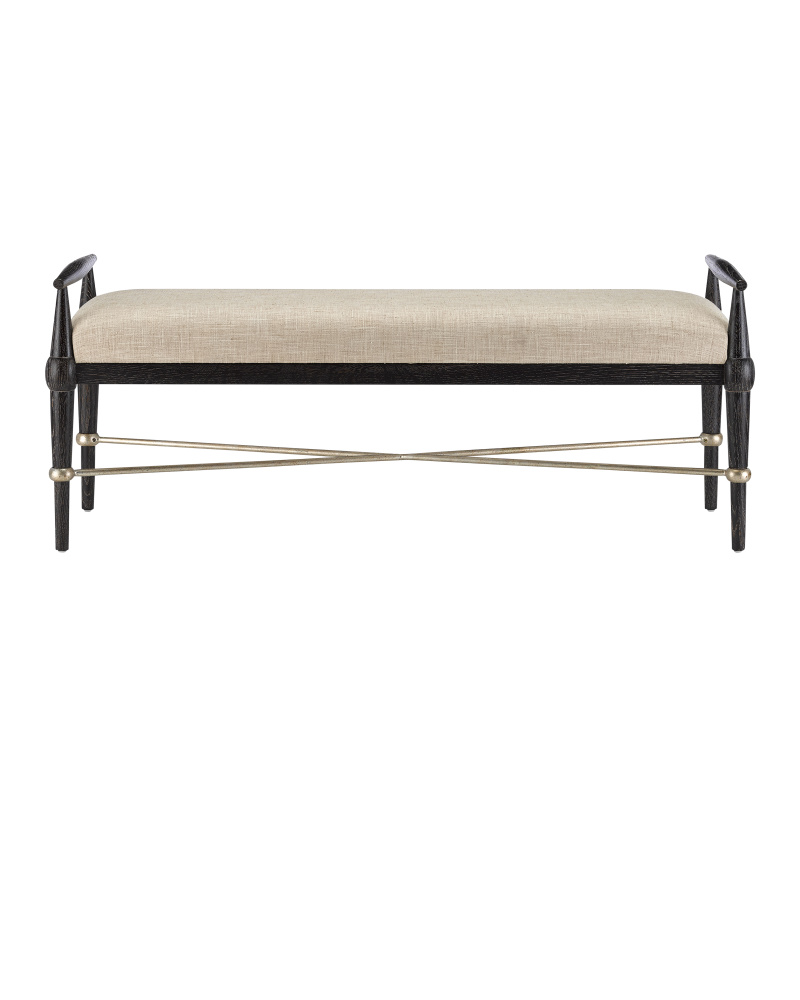 The Perrin Black Bench is a take on mid-century modern but with a slight transitional twist. Made of oak in an ebonized taupe finish, the dark brown bench is ornamented with iron stretchers in a silver Granello finish. It is upholstered in Finn Natural fabric, which is made of 100 percent polyester.